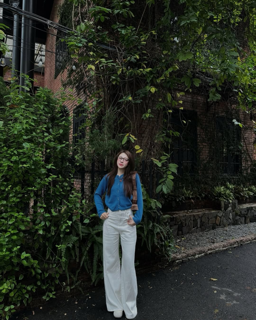 Với những buổi cà phê cuối tuần, cardigan xanh cô ban phối cùng quần trắng ống rộng là gợi ý dễ áp dụng. Cardigan dáng ôm nhẹ giúp vóc dáng trông gọn gàng, trong khi quần ống rộng tạo sự cân đối về tỷ lệ. Sự kết hợp giữa xanh và trắng nhẹ nhàng nhưng vẫn chỉn chu. ẢNH: @MYYYYYYYY_Y