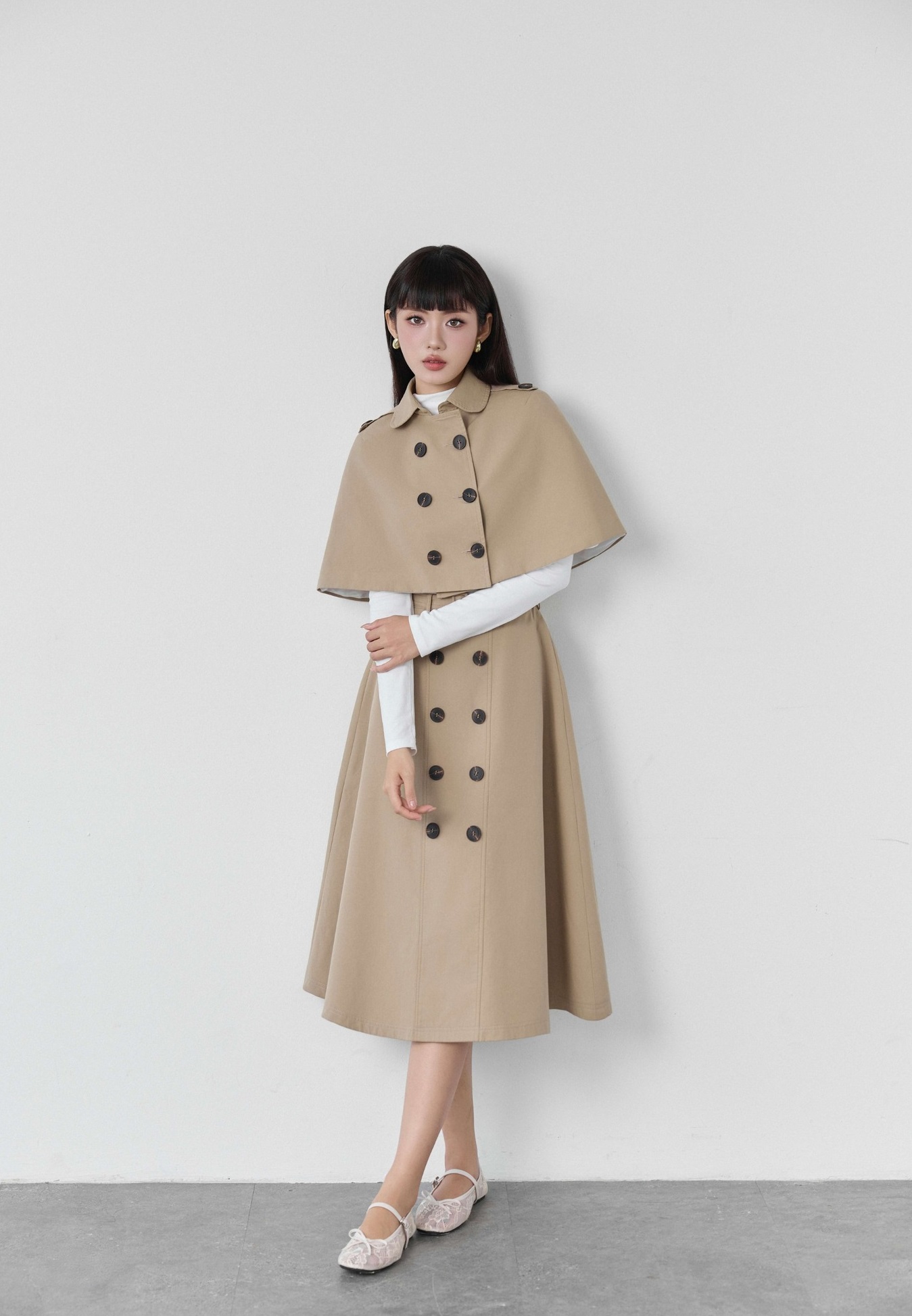 Tông màu beige từ chất liệu kaki luôn nằm trong lựa chọn top đầu của các cô gái. Phần cape khoác rời tạo điểm nhấn cổ điển, gợi nhớ đến phong cách châu Âu, trong khi phom váy xòe nhẹ giúp tôn dáng và tạo sự uyển chuyển. ẢNH: BYNOIR STUDIO