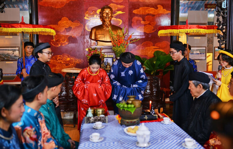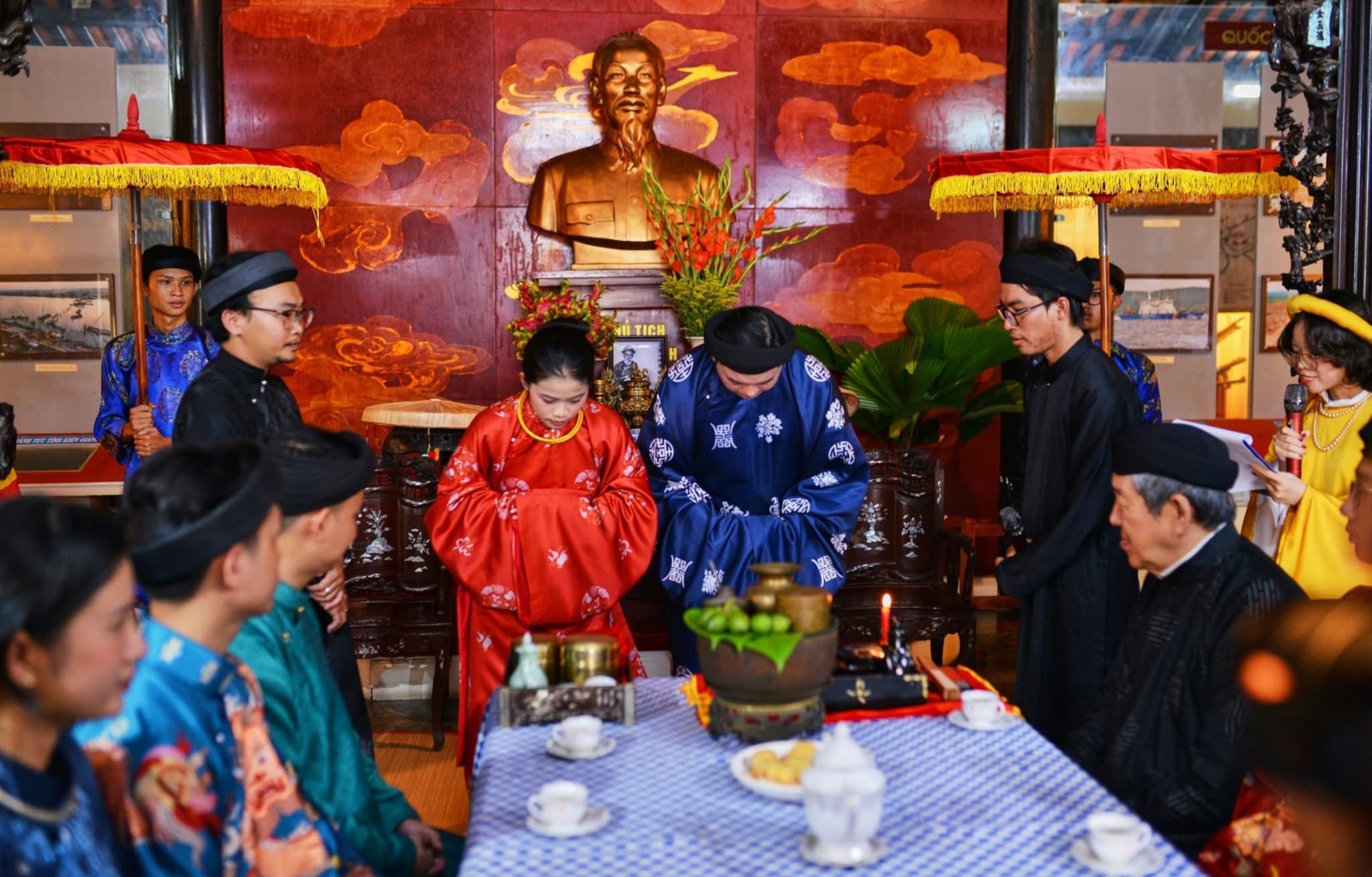Sân khấu hóa một số nghi thức trong đám cưới Nam Kỳ được Bảo tàng tỉnh thực hiện. Ảnh: Bảo tàng tỉnh cung cấp