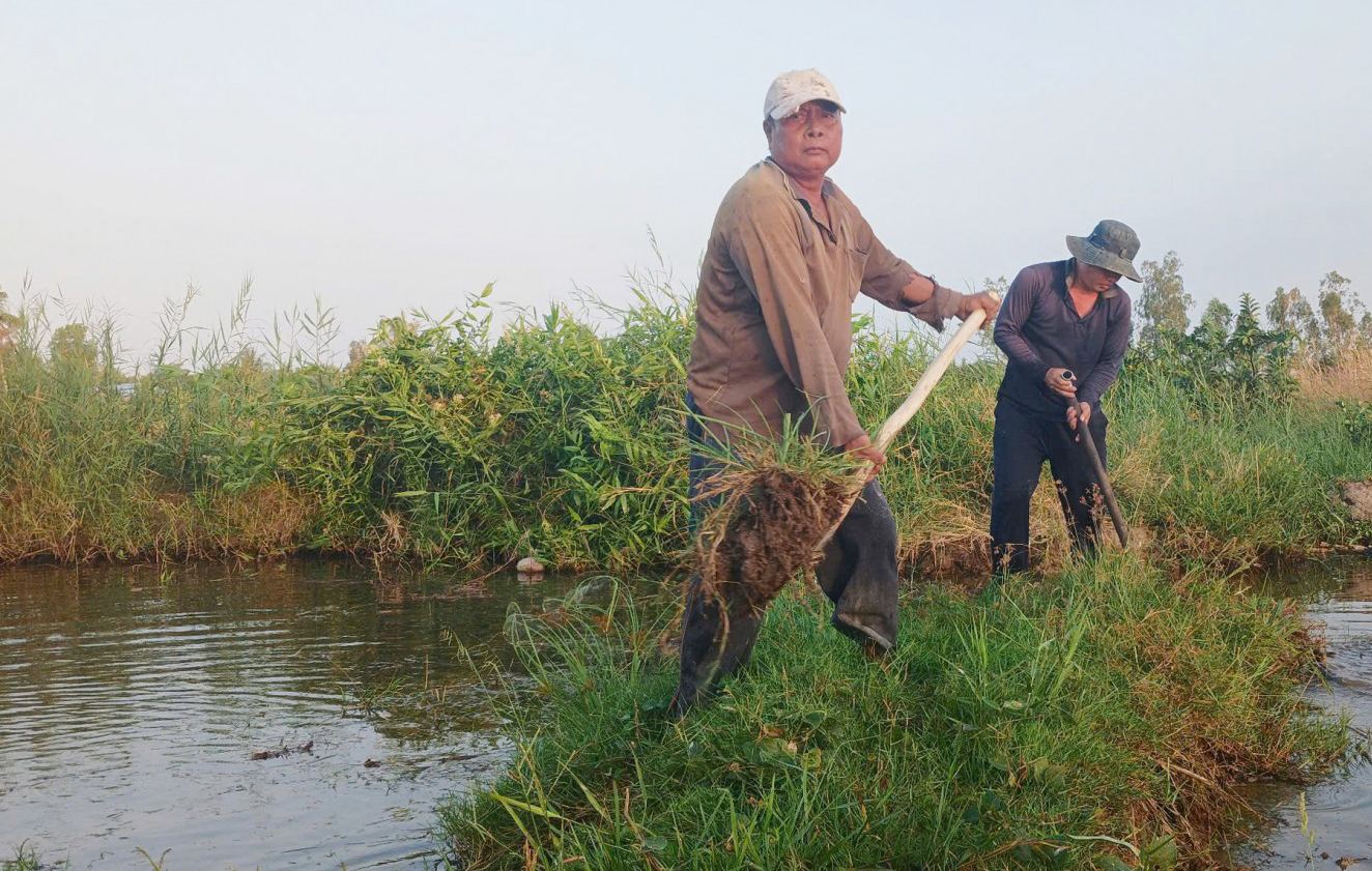 Ông Danh Mùng (61 tuổi), ngụ xã An Biên, đào đất gia cố bờ bao nuôi tôm.
