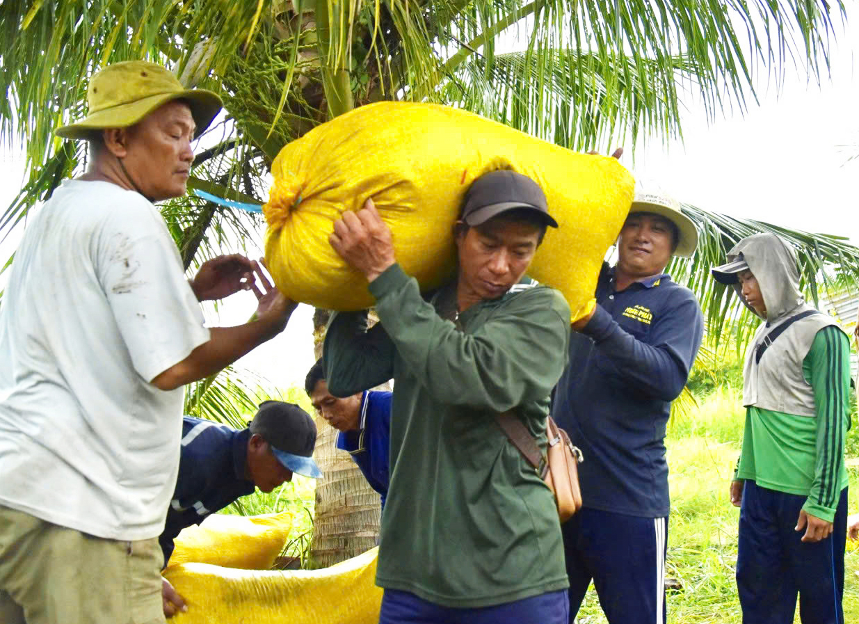 Lao động Tổ dịch vụ nông nghiệp ấp Bào Môn, xã An Biên vác lúa cho người dân trong ấp.