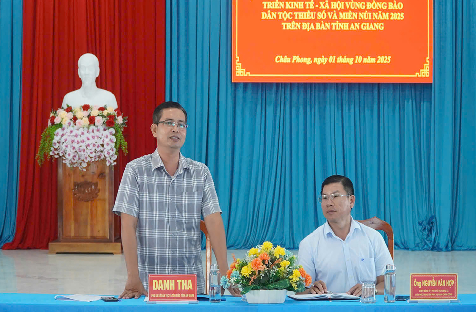 Phó Giám đốc Sở Dân tộc và Tôn giáo tỉnh An Giang Danh Tha phát biểu tại buổi làm việc với UBND xã Châu Phong.