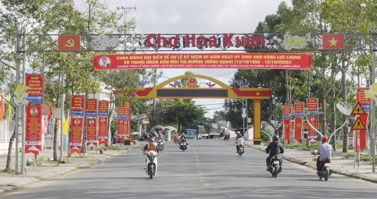Các tuyến đường trung tâm xã Giồng Riềng rực rỡ cờ, băng rôn chào mừng Lễ hội.