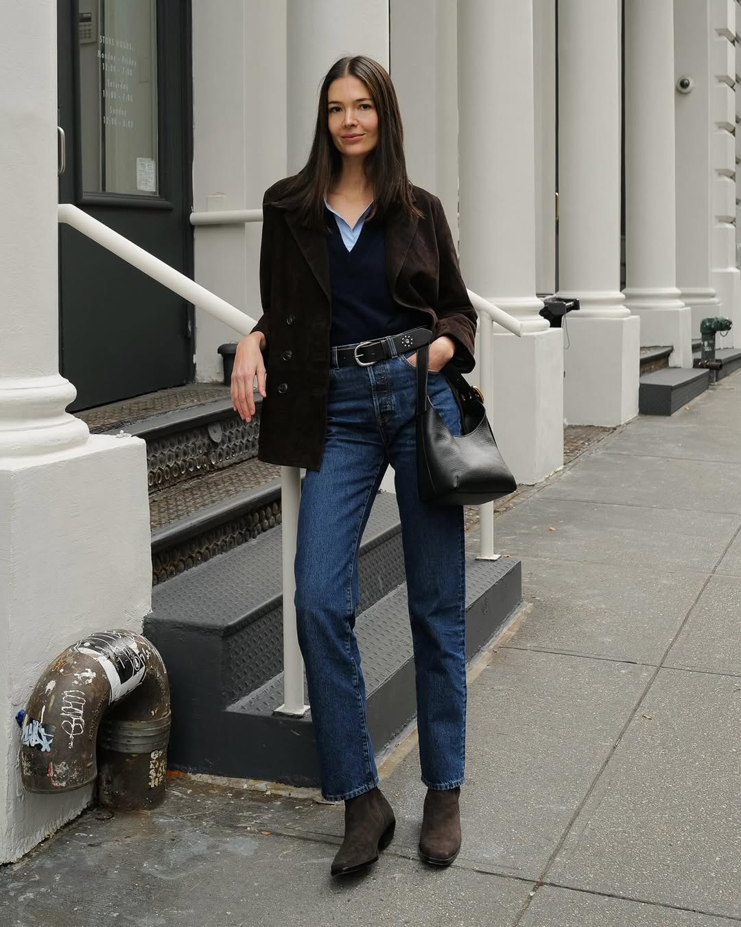 Nữ tín đồ thời trang khéo léo xếp nhiều lớp trang phục cho bản phối đường phố gồm sơ mi xanh, gile len mềm, quần jeans ống đứng và một chiếc áo khoác blazer chỉn chu làm từ da lộn đồng điệu với bốt. ẢNH: RENATA QUAGLIA
