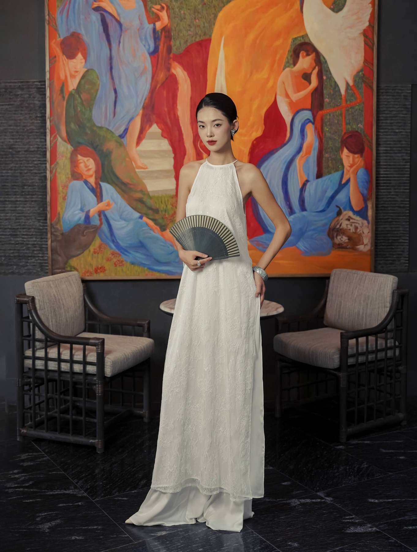 Áo dài lụa trắng cổ yếm chất liệu mềm rủ nhưng có độ đứng nhẹ, tạo nên vẻ dịu dàng mà sang trọng, gợi nhớ đến nét đoan trang của người phụ nữ xưa nhưng lại rất hợp với phong cách đương đại. ẢNH: ÁO DÀI SON