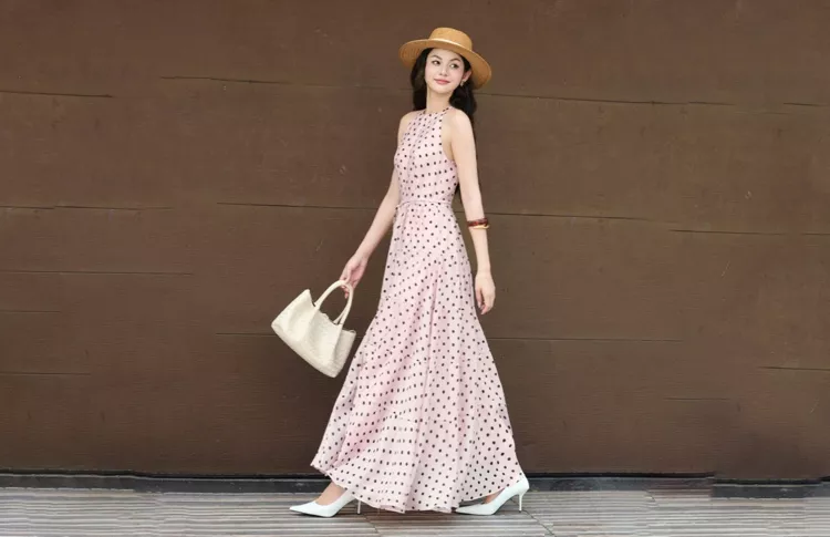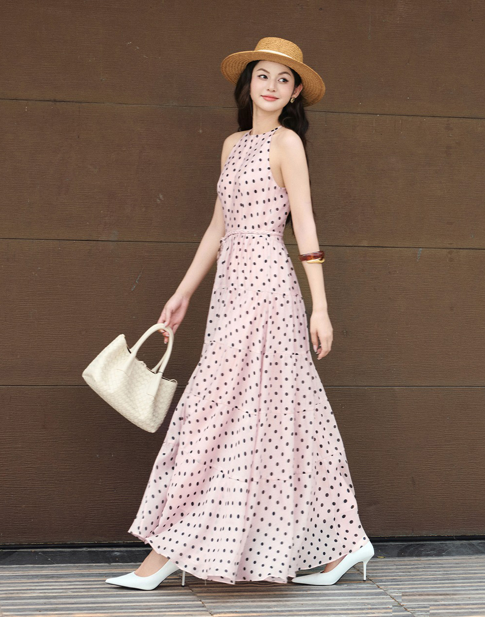 Một gợi ý trang phục thoáng mát, nhẹ nhàng nhưng đầy phong cách với sự phù hợp của trang phục và phụ kiện. Váy maxi cổ yếm màu hồng pastel chấm bi tùng xòe thướt tha được nàng phối cùng giày cao gót và túi màu trắng. Phụ kiện mũ cói rộng vành và vòng tay đá tô điểm cho diện mạo rạng ngời, xinh tươi. ẢNH: CAMELLIA