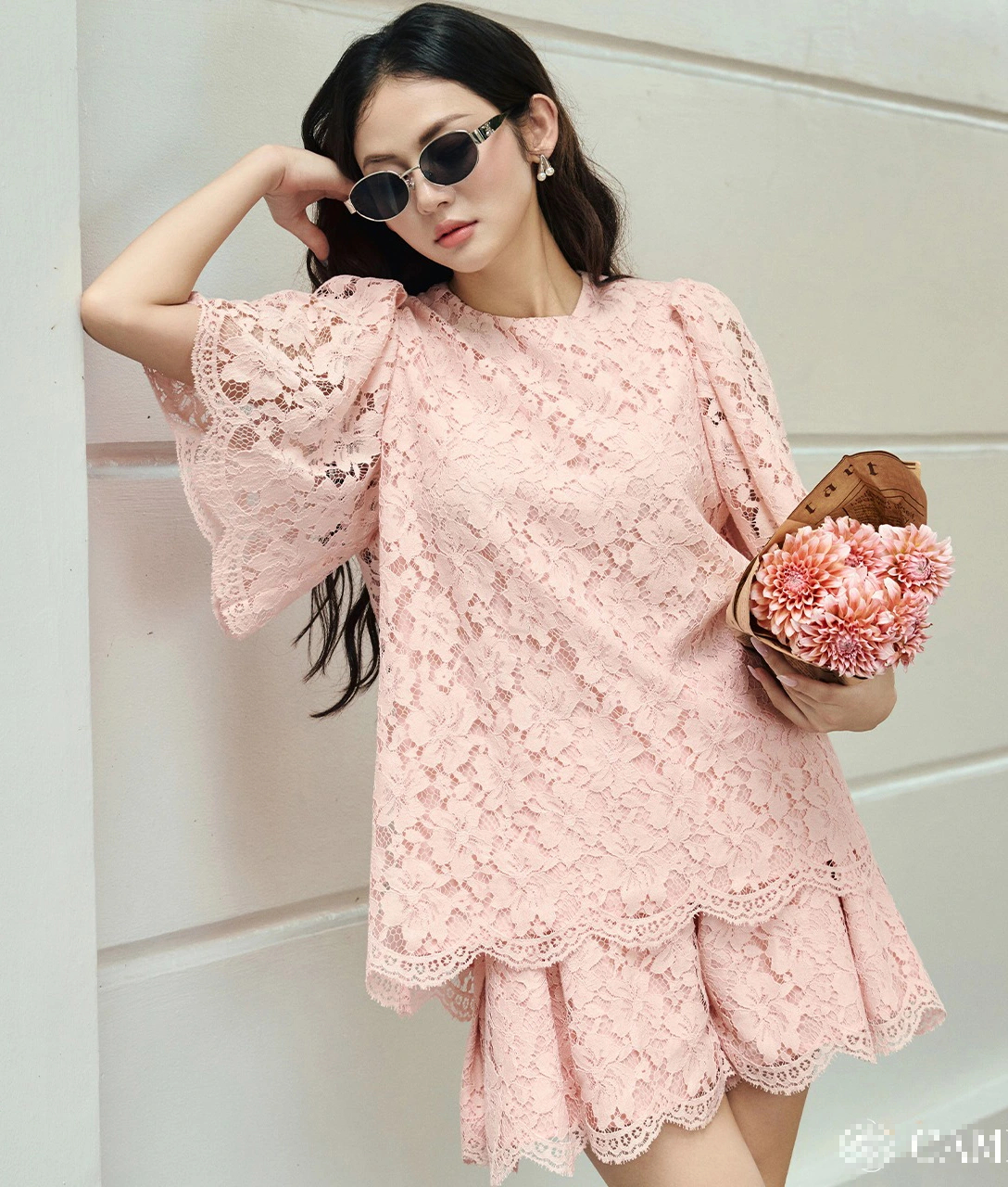 Vải ren hồng pastel tôn trọn nét ngọt ngào, lãng mạn. Bản phối trẻ trung này lý tưởng cho những ngày dài thư giãn, tụ họp bạn bè hay dạo phố ngắm cảnh... ẢNH: CAMELLIA