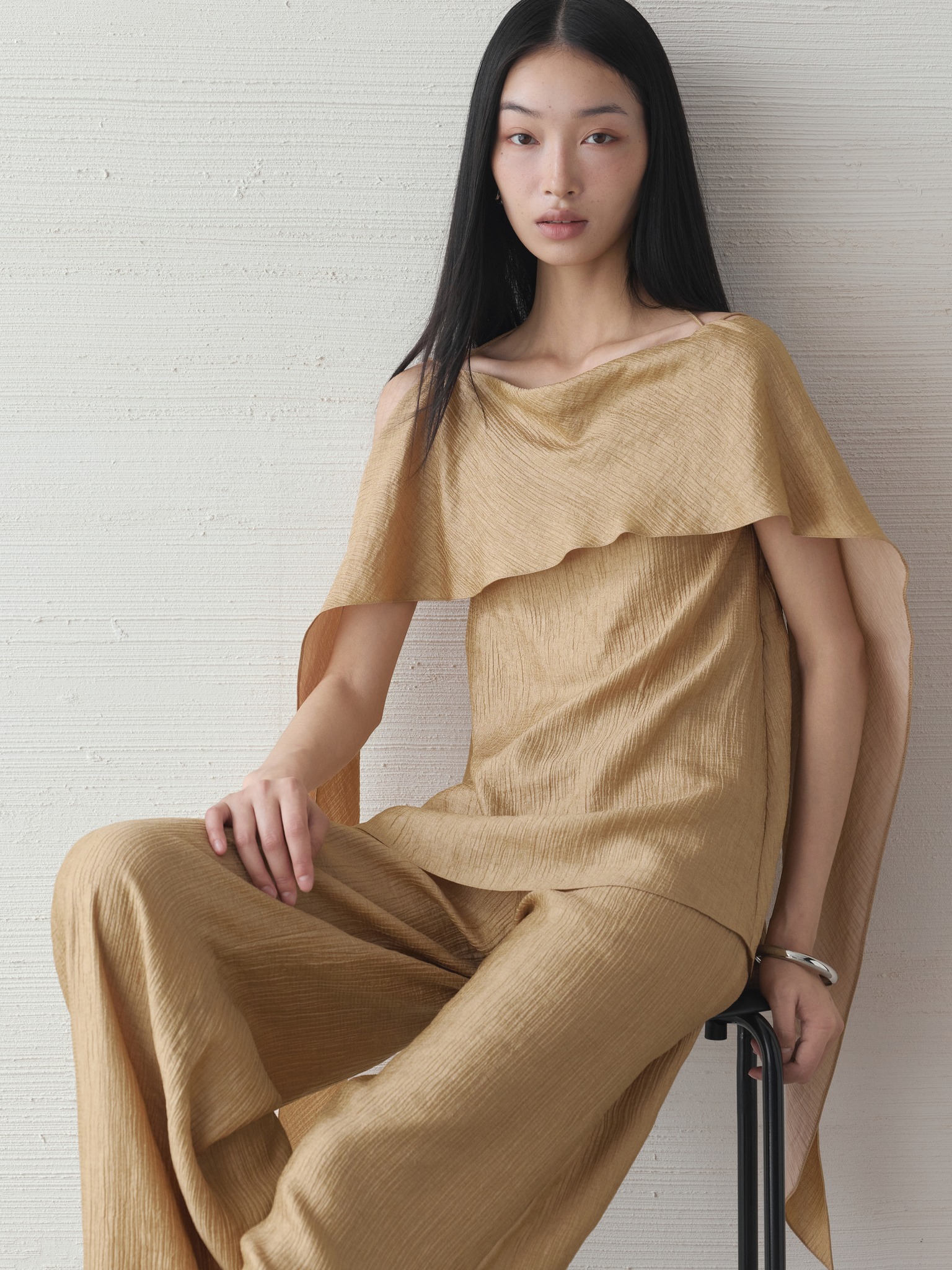 Trang phục đơn sắc theo set phối sẵn gây ấn tượng mạnh bởi sự nhẹ nhàng và linh hoạt. Vẫn là cảm giác trang phục mặc nhà thư thái nhưng đan cài vẻ ngoài trang trọng và sự chỉn chu trong từng nếp vải. ẢNH: NOSBYN STUDIO