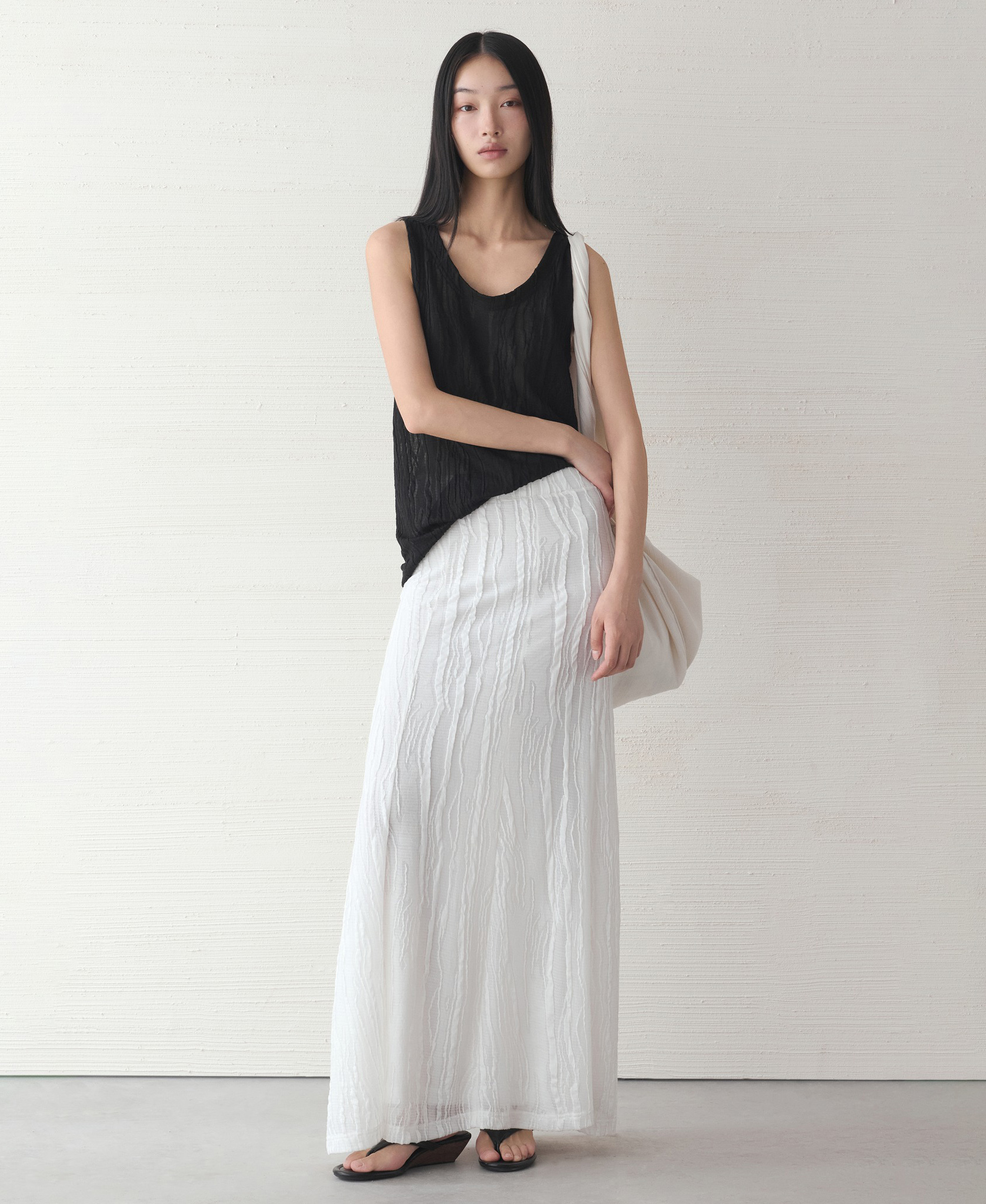 Áo ba lỗ và chân váy dài đen trắng ghi điểm qua chất vải gân nổi trên bề mặt. Độ trong mờ của vải và phom suông nhẹ của trang phục khẽ đưa nàng bước ra khỏi những áp lực thường ngày. ẢNH: NOSBYN STUDIO
