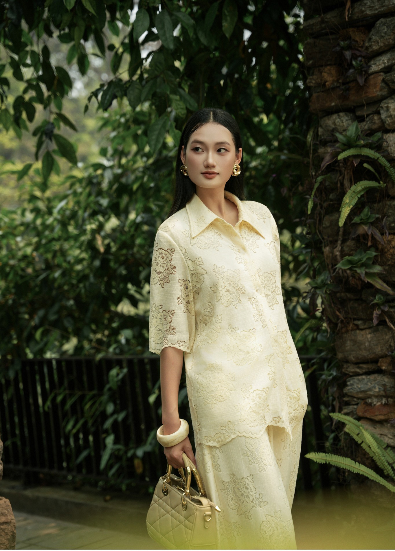 Áo sơ mi tay lỡ phối quần ống rộng cùng chất vải, cùng màu sắc phản ánh tư duy thời trang hiện đại, linh hoạt giàu bản sắc của quý cô. ẢNH: ELISE
