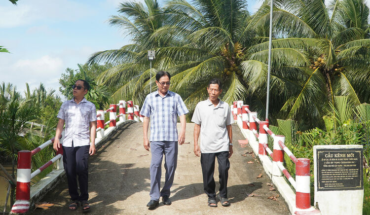 Từ tổ 4 đến tổ 5 đường rộng rãi, 2 chiếc xe máy tránh nhau dễ dàng. Chúng tôi dừng lại trước cầu Kênh Mới, bắc qua một nhánh kênh thủy lợi quan trọng. Cây cầu bê tông chắc chắn, thành lan can kiên cố, tổng kinh phí xây dựng 355 triệu đồng do ông Võ vận động nhà hảo tâm hỗ trợ, người dân địa phương góp ngày công.
