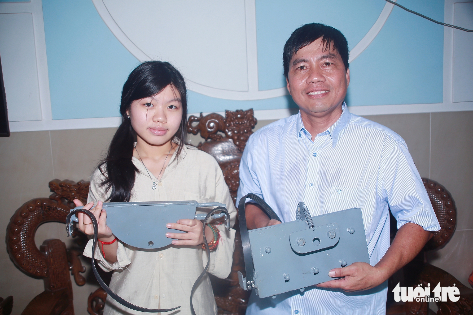 Anh Nguyễn Toại Nguyện cùng con gái tìm giải pháp thoát hiểm cháy nổ nhà cao tầng bằng cáp xiên đơn - Ảnh: NGỌC KHẢI
