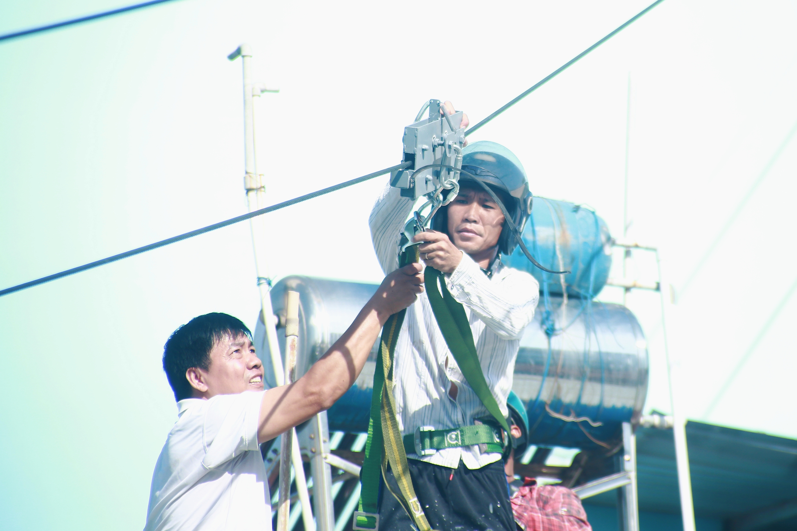 Anh Nguyễn Toại Nguyện (trái) trong một lần chuẩn bị thử nghiệm thiết bị thả chậm theo dây cáp xiên đơn - Ảnh: NGỌC KHẢI