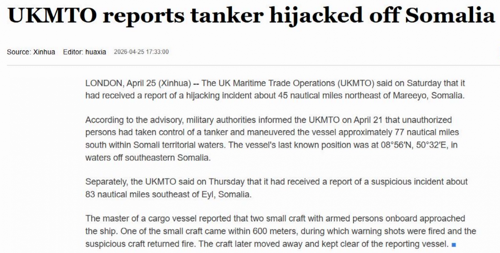 UKMTO cho biết đã nhận được thông báo rằng, một số đối tượng đã chiếm quyền kiểm soát một tàu chở dầu và điều khiển tàu đi khoảng 77 hải lý về phía nam trong vùng lãnh hải của Somalia. Vị trí cuối cùng được biết đến của tàu là trong vùng biển ngoài khơi phía đông nam Somalia.