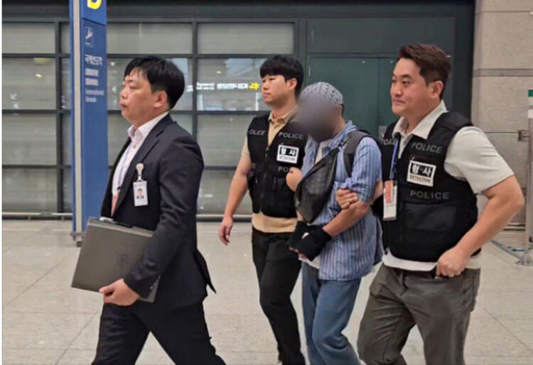 Một trong những nghi phạm bị dẫn độ qua Sân bay Quốc tế Incheon sau khi cảnh sát bắt giữ 114 thành viên của một đường dây tội phạm có trụ sở tại Campuchia. Ảnh: YONHAP