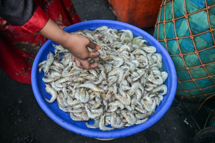Tôm tươi sống được bày bán ở một ngôi chợ truyền thống tại phía đông đảo Java, Indonesia - Ảnh: AFP