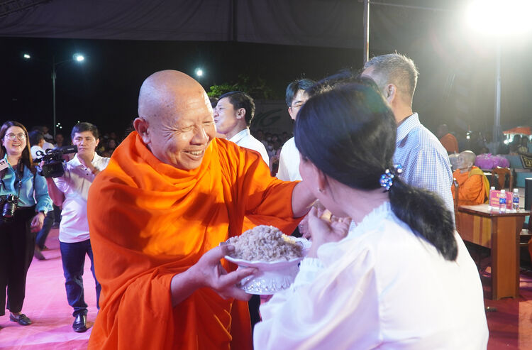 Đút cốm dẹp vào dịp lễ Ok Om Bok. Ảnh: DANH THÀNH