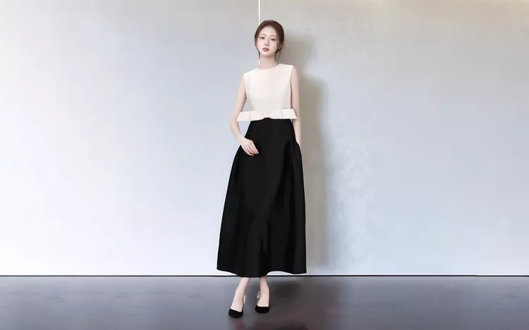 Cách đơn giản để gây hiệu ứng thị giác thon gọn cho phần cơ thể nàng thiếu tự tin chính là diện các bộ trang phục phối hai màu trắng, đen. Phần thân trên ôm nhẹ mang lại cảm giác mảnh mai, tùng váy cấu trúc phồng hạ eo hướng ánh nhìn vào vẻ cân đối hài hòa của tổng thể thay vì tập trung vào chi tiết. ẢNH: RẬP