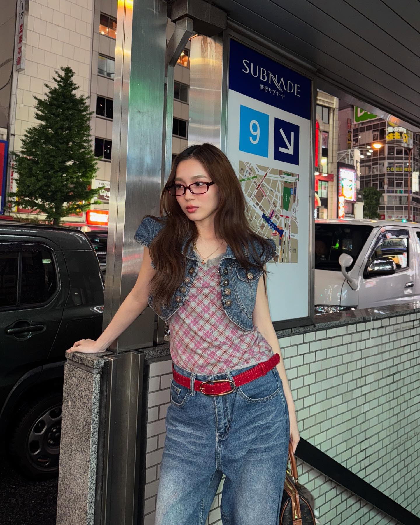 Một chiếc áo họa tiết ca rô hồng - xám với phom dáng gọn gàng, khi kết hợp cùng áo khoác denim lửng, tổng thể lập tức được cân bằng lại, giảm bớt cảm giác “kẹo ngọt” và thêm vào nét cá tính. Quần jeans xanh nhạt mang đến sự thoải mái, đúng tinh thần Y2K nhưng vẫn dễ ứng dụng trong đời sống thường ngày. ẢNH: @LOVERRUKK