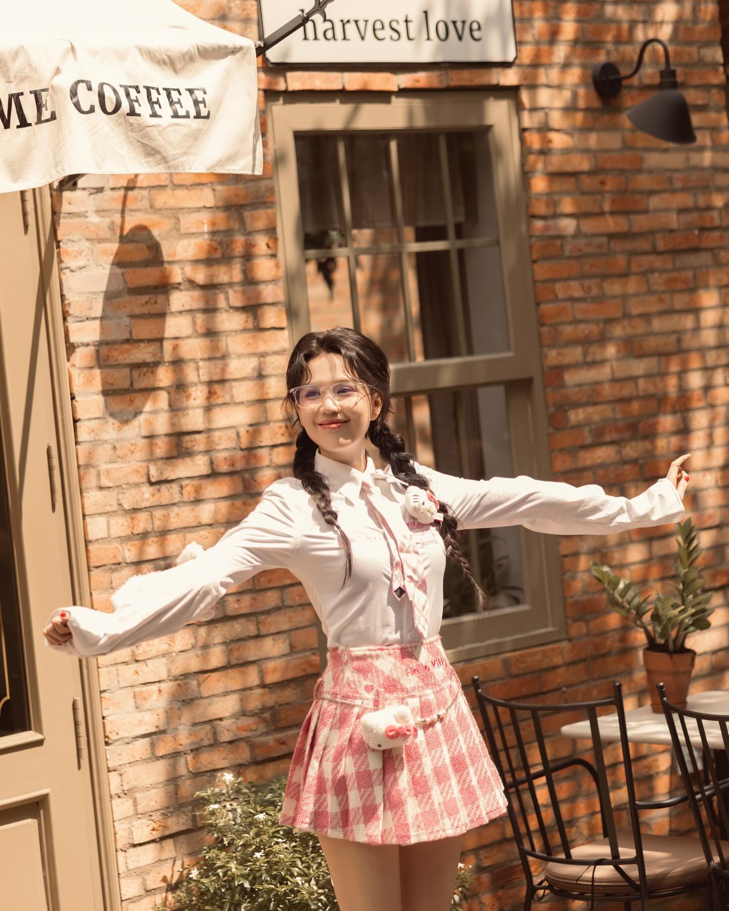Cô nàng “mọt sách” đáng yêu với bản phối giữa sơ mi trắng cổ điển và chân váy ca rô xếp ly ngắn. Chiếc cà vạt hồng tone sur tone với váy là chi tiết nhỏ nhưng mang lại hiệu quả lớn, giúp tổng thể trở nên đồng bộ và có chiều sâu hơn. Các phụ kiện như kính giả cận và giày búp bê hoàn thiện hình ảnh học đường chỉn chu, gợi cảm giác tri thức nhưng vẫn rất trẻ trung, tinh nghịch. ẢNH: @NGOCTRINH89