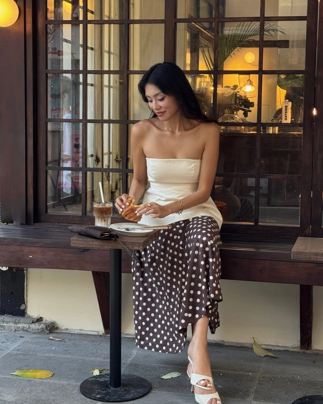 Thảo Nhi Lê lựa chọn set đồ nổi bật với chân váy xòe midi nâu đậm họa tiết chấm bi trắng lớn, phối cùng áo lụa trắng kem mềm mại. Sự tương phản nhẹ nhàng giữa hai tông màu trung tính giúp cô ghi điểm tuyệt đối về sự tinh tế. Đây là gợi ý hoàn hảo cho những buổi cà phê hay thưởng trà chiều.