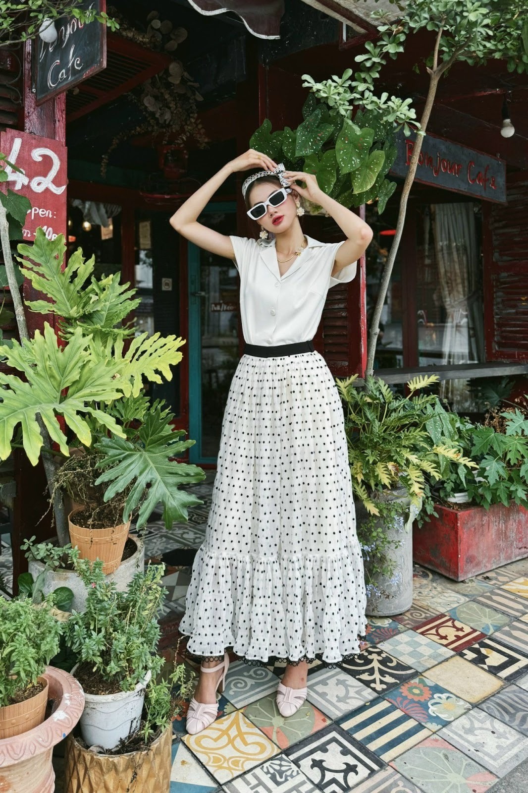 Áo được sơ vin gọn gàng với chân váy chấm bi bồng bềnh phía dưới. Chân váy họa tiết chấm bi đen trên nền vải màu trắng với mật độ vừa phải nên khi nhìn từ xa tạo cảm giác cổ điển. Phần váy voan mỏng mang lại sự thướt tha cho người mặc.