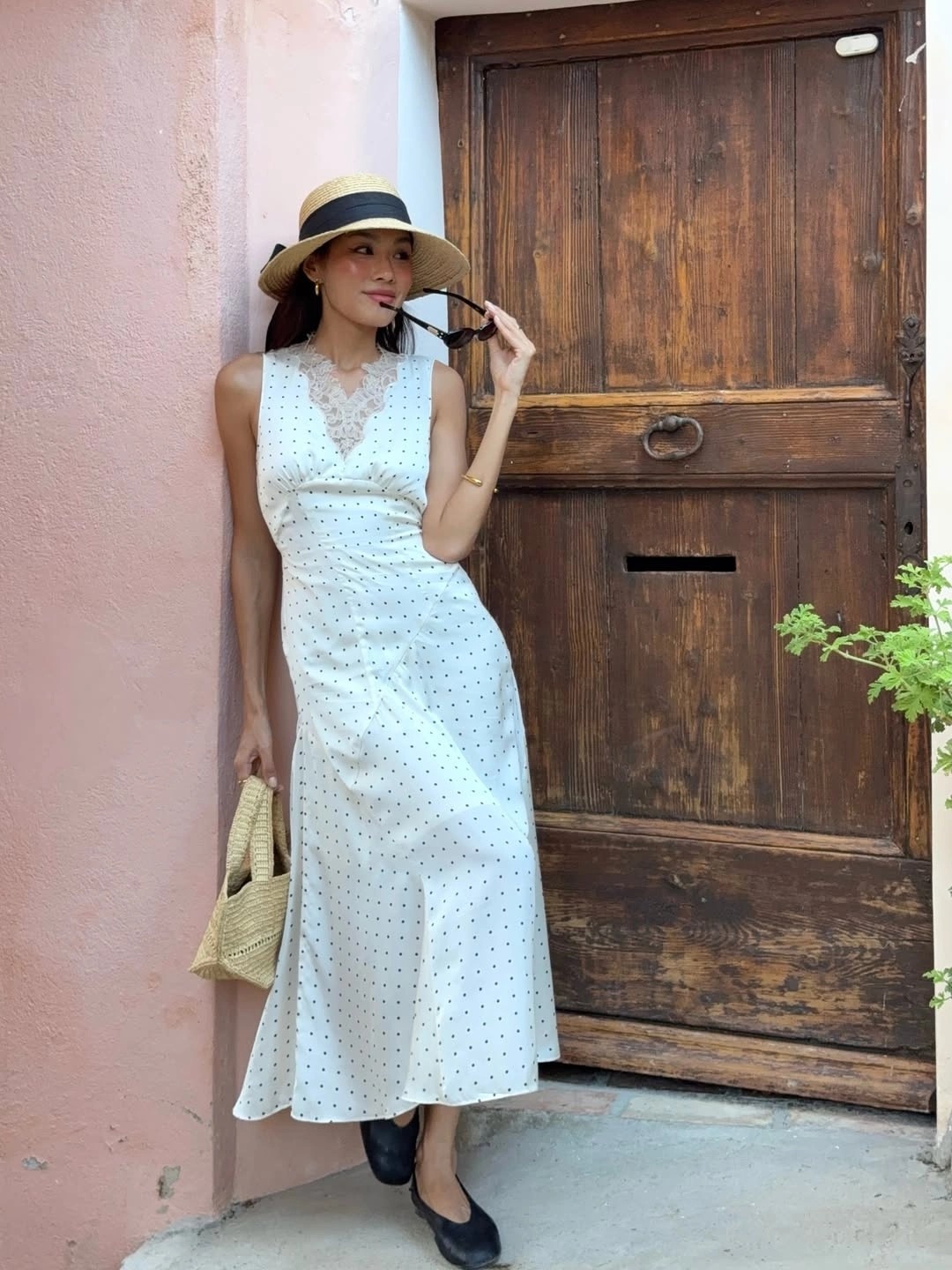 Sự kết hợp giữa phom dáng nữ tính và họa tiết cổ điển mang đến nét đẹp nhẹ nhàng như tiểu thư Paris mà bất kỳ cô gái nào cũng muốn sở hữu. Đầm maxi trắng họa tiết chấm bi li ti, thiết kế ôm nhẹ ở eo, cổ chữ V phối ren sát nách, tạo cảm giác thanh thoát. Thảo Nhi Lê kết hợp cùng mũ cói rộng vành, tạo nên tổng thể đậm chất vintage.