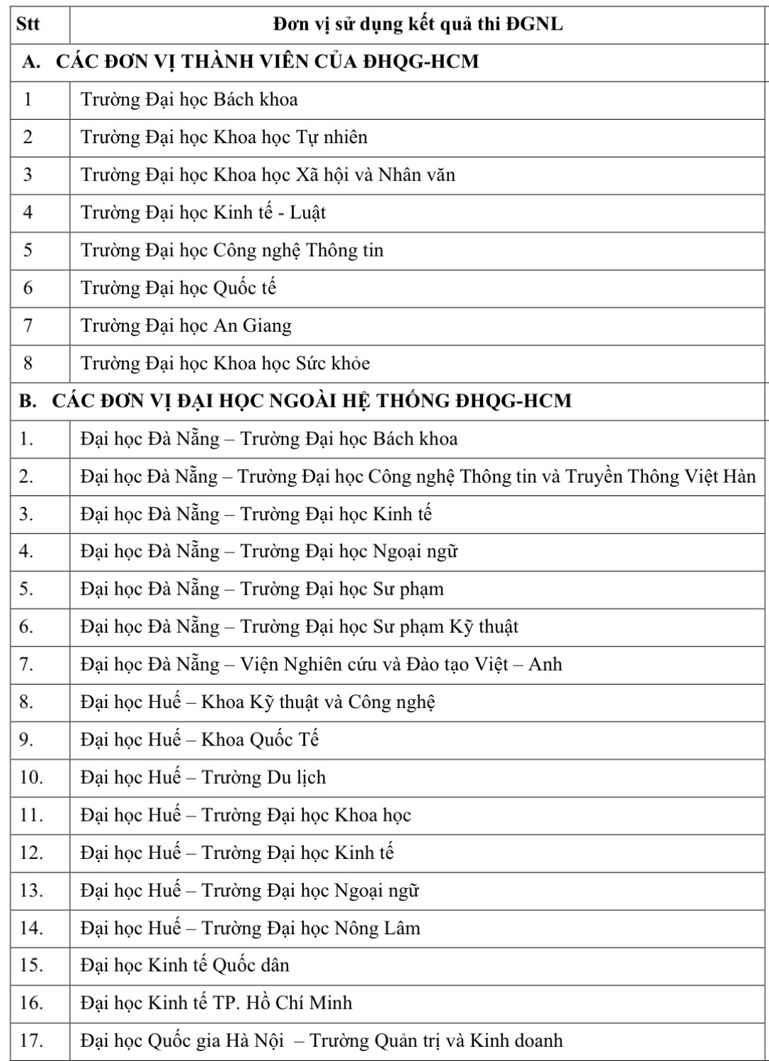 Bên cạnh đó, 94 đơn vị đào tạo đại học khác ngoài hệ thống đại học Quốc gia TP. Hồ Chí Minh có sử dụng kết quả này xét tuyển một phần chỉ tiêu tuyển sinh năm nay. Trong số này có nhiều đại học gồm: đại học Đà Nẵng, đại học Huế, đại học Kinh tế quốc dân, đại học Kinh tế TP. Hồ Chí Minh, đại học Trà Vinh, đại học Duy Tân.