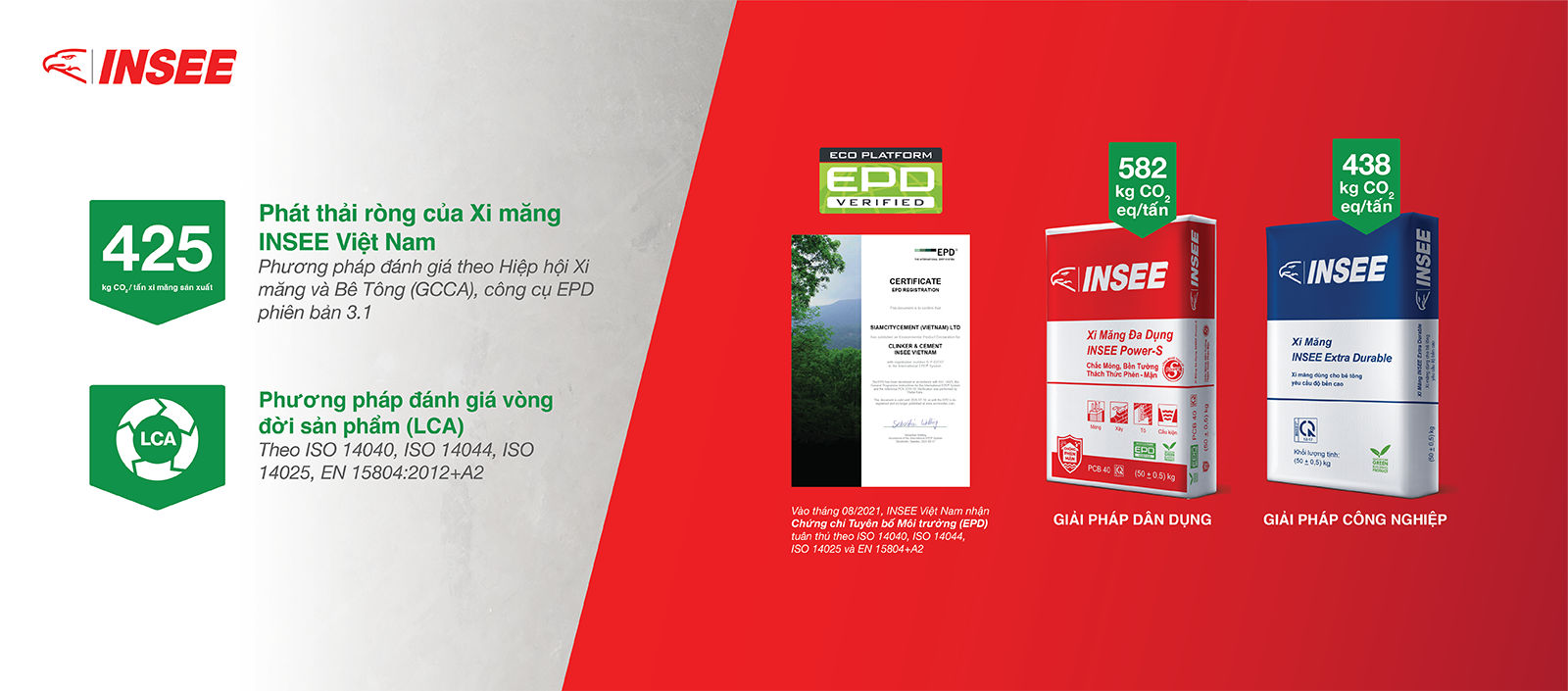 Không dừng lại ở đó, INSEE còn là doanh nghiệp tiên phong tại Việt Nam phát triển danh mục sản phẩm xi măng xanh được quốc tế công nhận. Từ năm 2017, các sản phẩm của INSEE đã đạt Nhãn Xanh do Hội đồng Công trình Xanh Singapore (SGBC) cấp. Đến năm 2021, INSEE tiếp tục khẳng định vị thế dẫn đầu khi trở thành nhà sản xuất xi măng đầu tiên tại Việt Nam đạt chứng chỉ Tuyên bố Môi trường quốc tế (EPD) từ Thụy Điển.