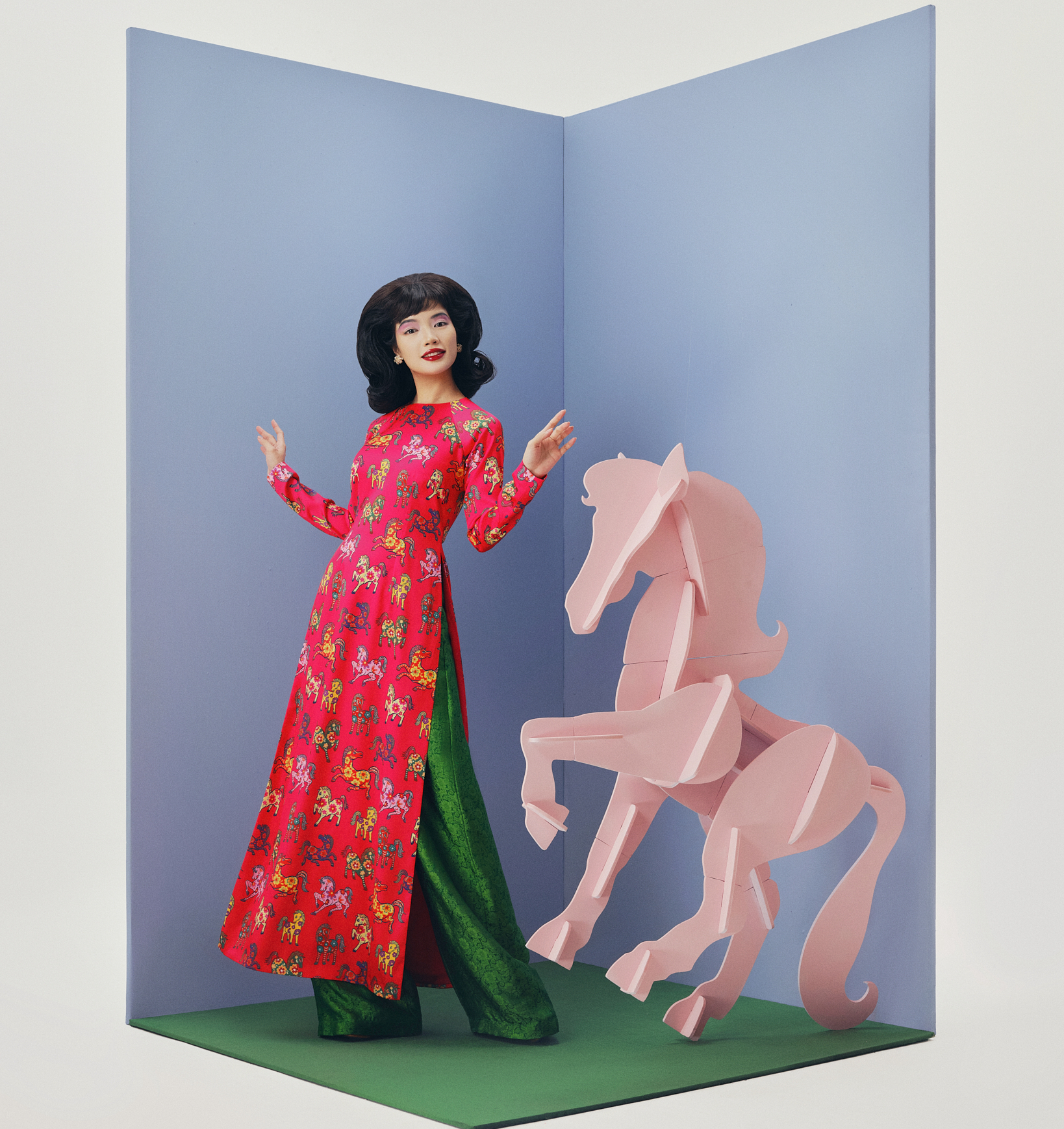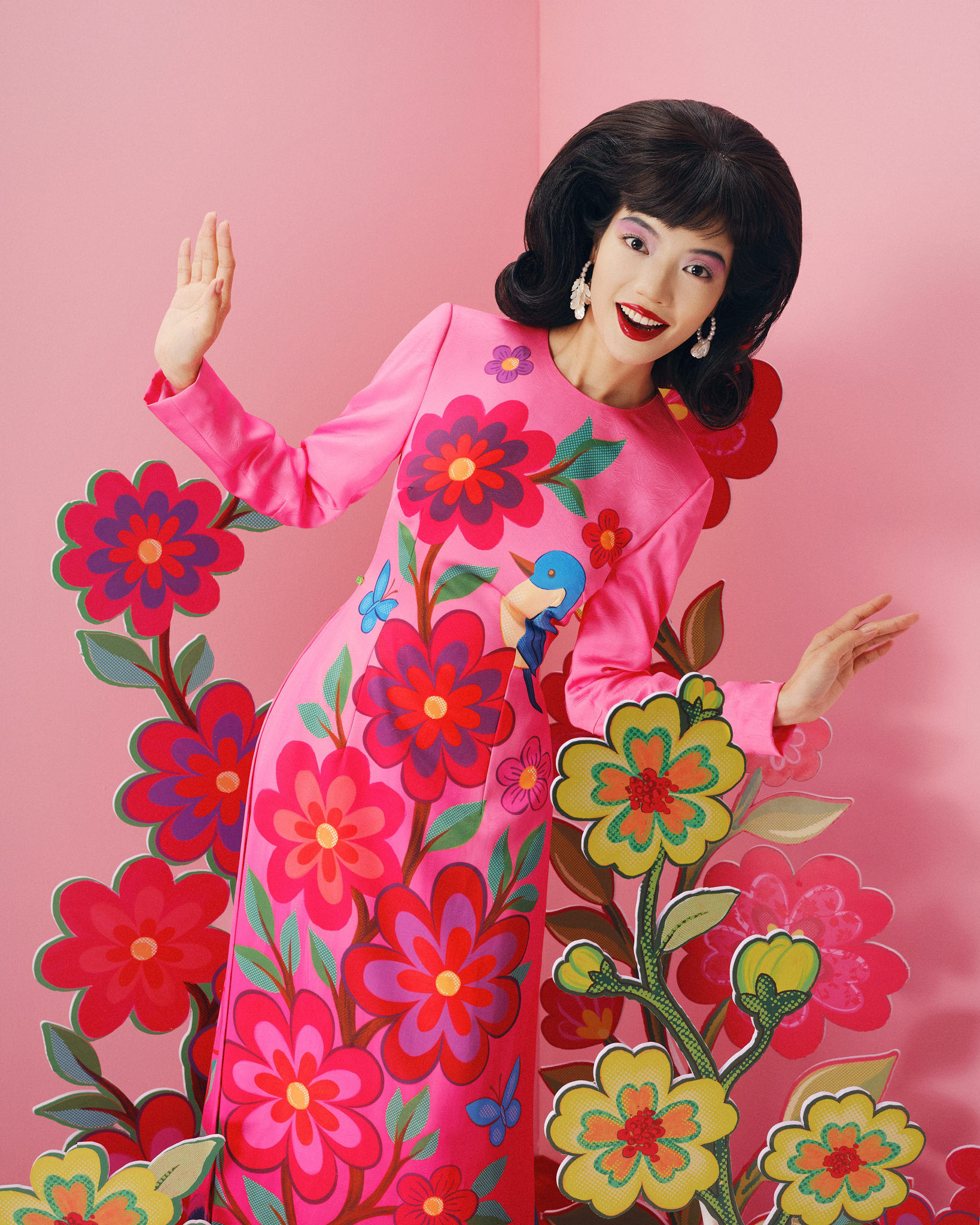 Áo dài không chỉ thiết kế để mặc mà còn được dàn dựng như một không gian văn hóa. Mỗi thiết kế như là một bức tranh nơi hoa lá, linh vật, màu sắc được sắp đặt bằng tư duy của một người làm nghệ thuật thị giác hơn là thời trang.