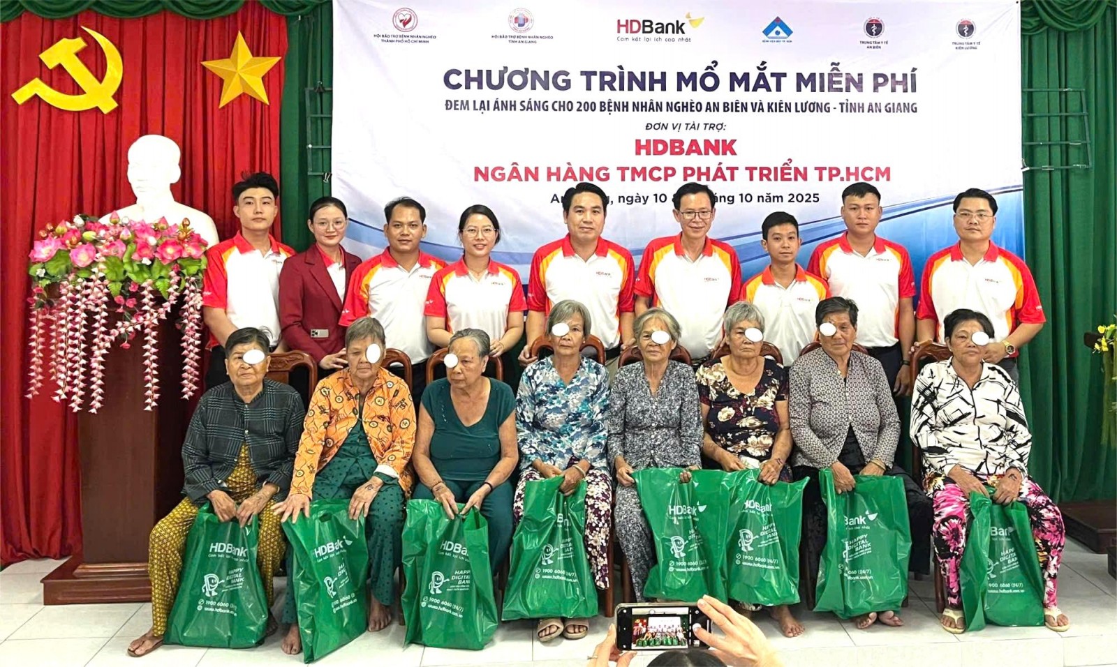 Đại diện HDBank chi nhánh Kiên Giang trao quà cho người dân vừa được phẫu thuật mắt.