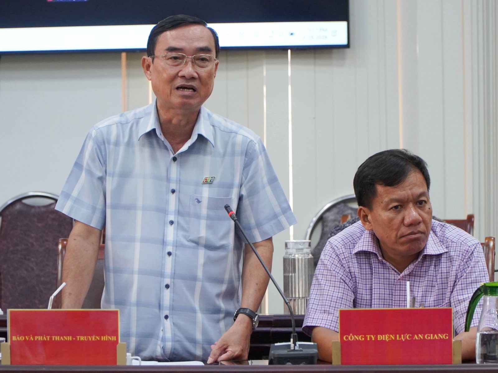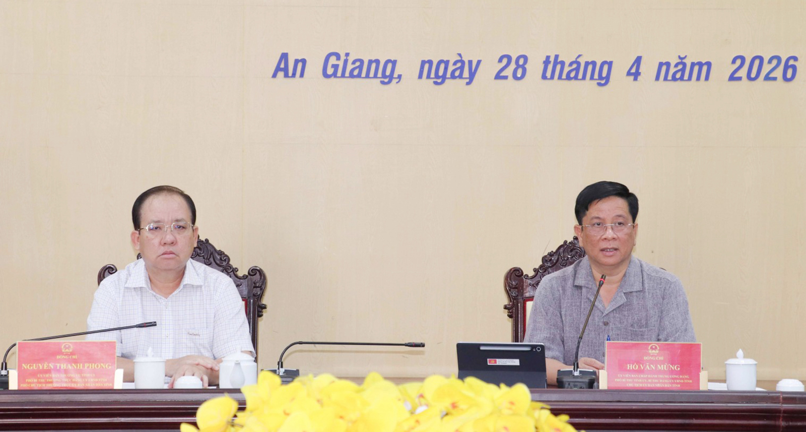 Chủ tịch UBND tỉnh An Giang Hồ Văn Mừng (bên phải) cùng Phó Chủ tịch Thường trực UBND tỉnh An Giang Nguyễn Thanh Phong tại cuộc họp.