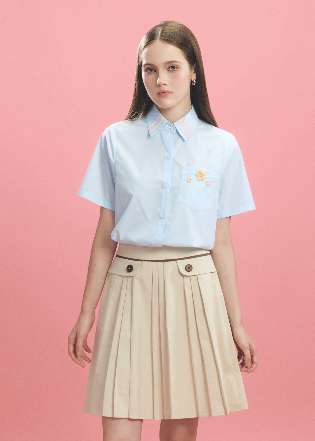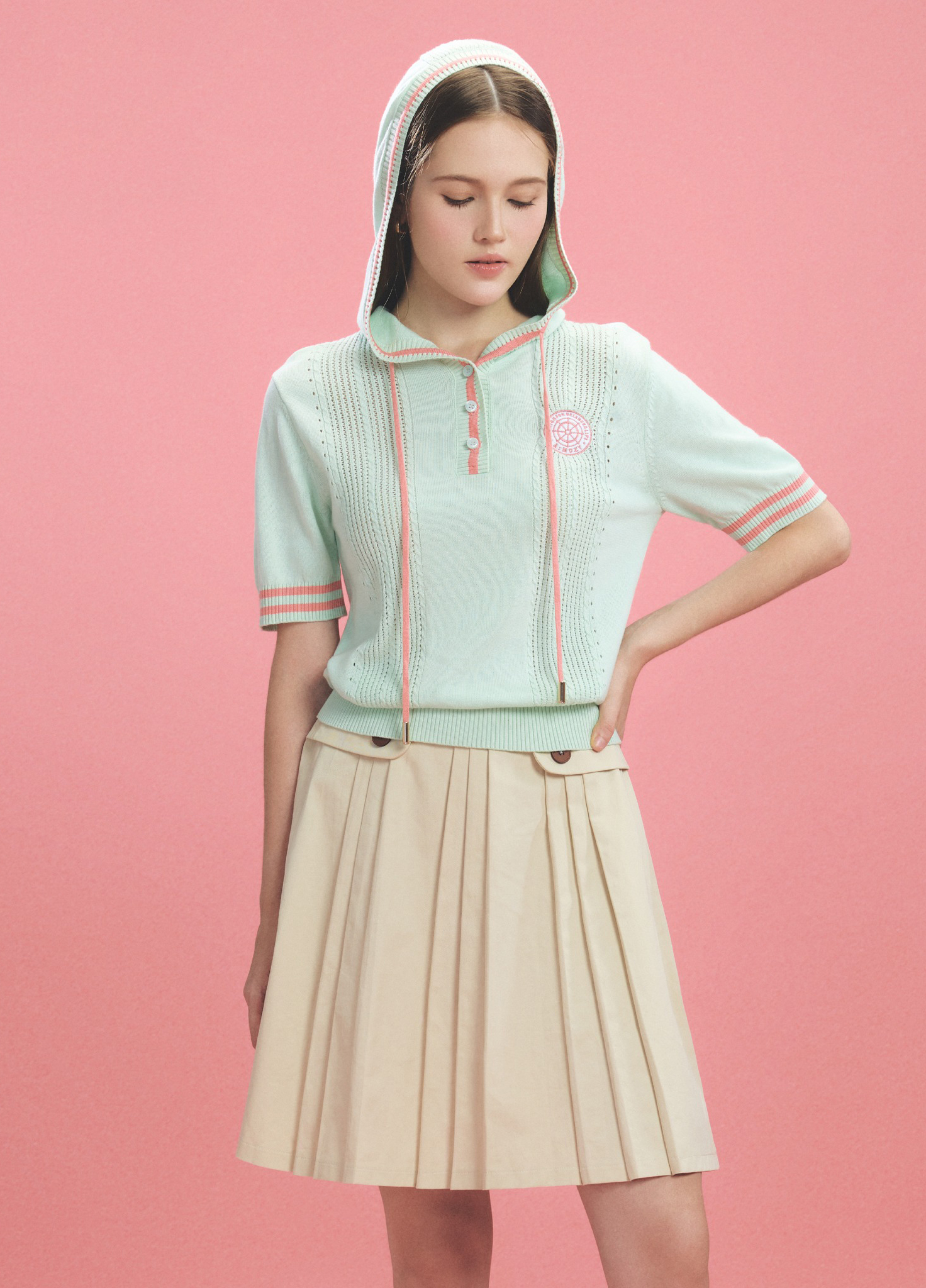 Áo polo dệt kim màu hồng phấn phối chân váy trắng xếp ly khắc họa tinh thần tươi trẻ, hiện đại và giàu sức sống. Hầu hết các thiết kế váy ngắn đều có quần bảo hộ may liền bên trong, vì thế nàng thỏa thích mặc đẹp, mặc chất mà chẳng phải e ngại bất cứ điều gì. ẢNH: K&K FASHION