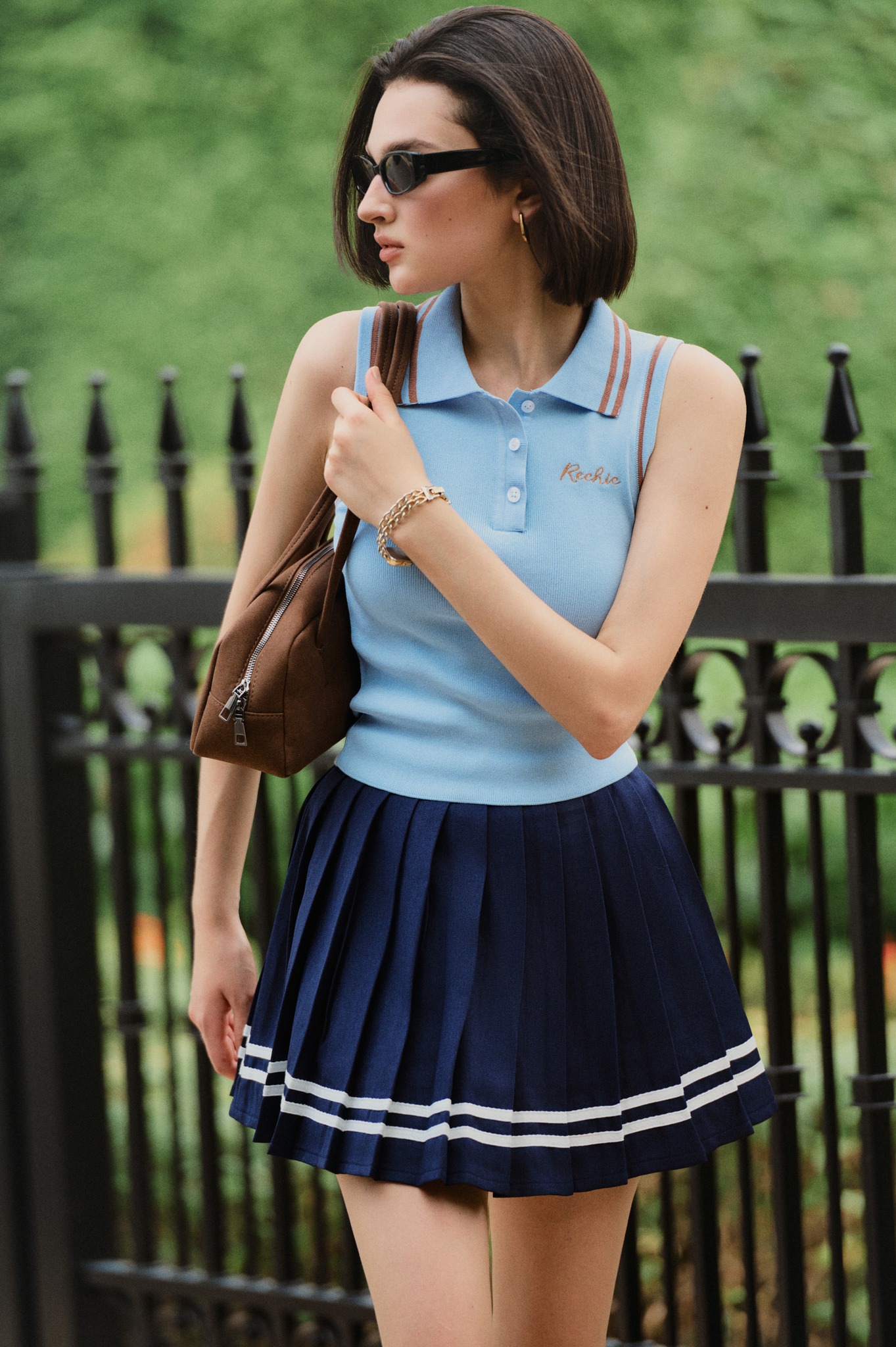 Điểm đặc trưng làm nên các thiết kế váy tennis chính là độ ngắn trên gối, dáng chữ A hoặc xếp ly. Những đường viền màu sắc nổi bật tạo nên điểm nhấn thu hút và là nét riêng của từng mẫu thiết kế. ẢNH: RECHIC