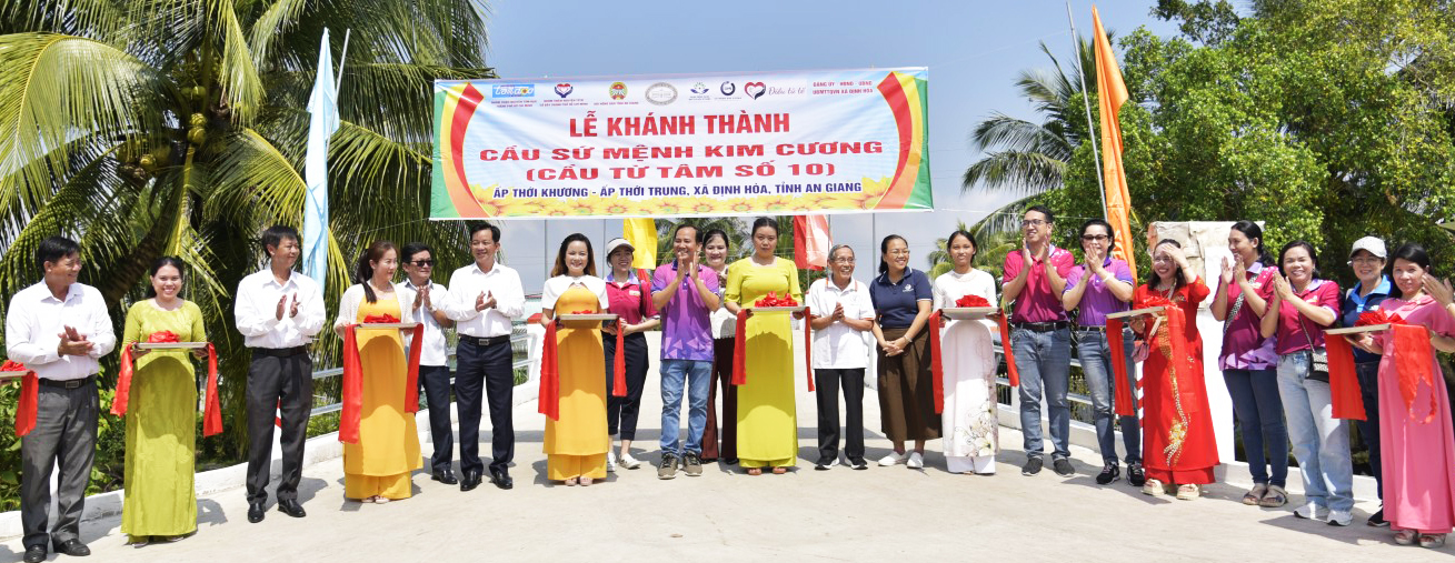 Lãnh đạo Hội Nông dân tỉnh An Giang, Ngân hàng Nhà nước chi nhánh Khu vực 15 và đơn vị tài trợ thực hiện nghi thức khánh thành cầu Sứ Mệnh Kim Cương tại xã Định Hòa.