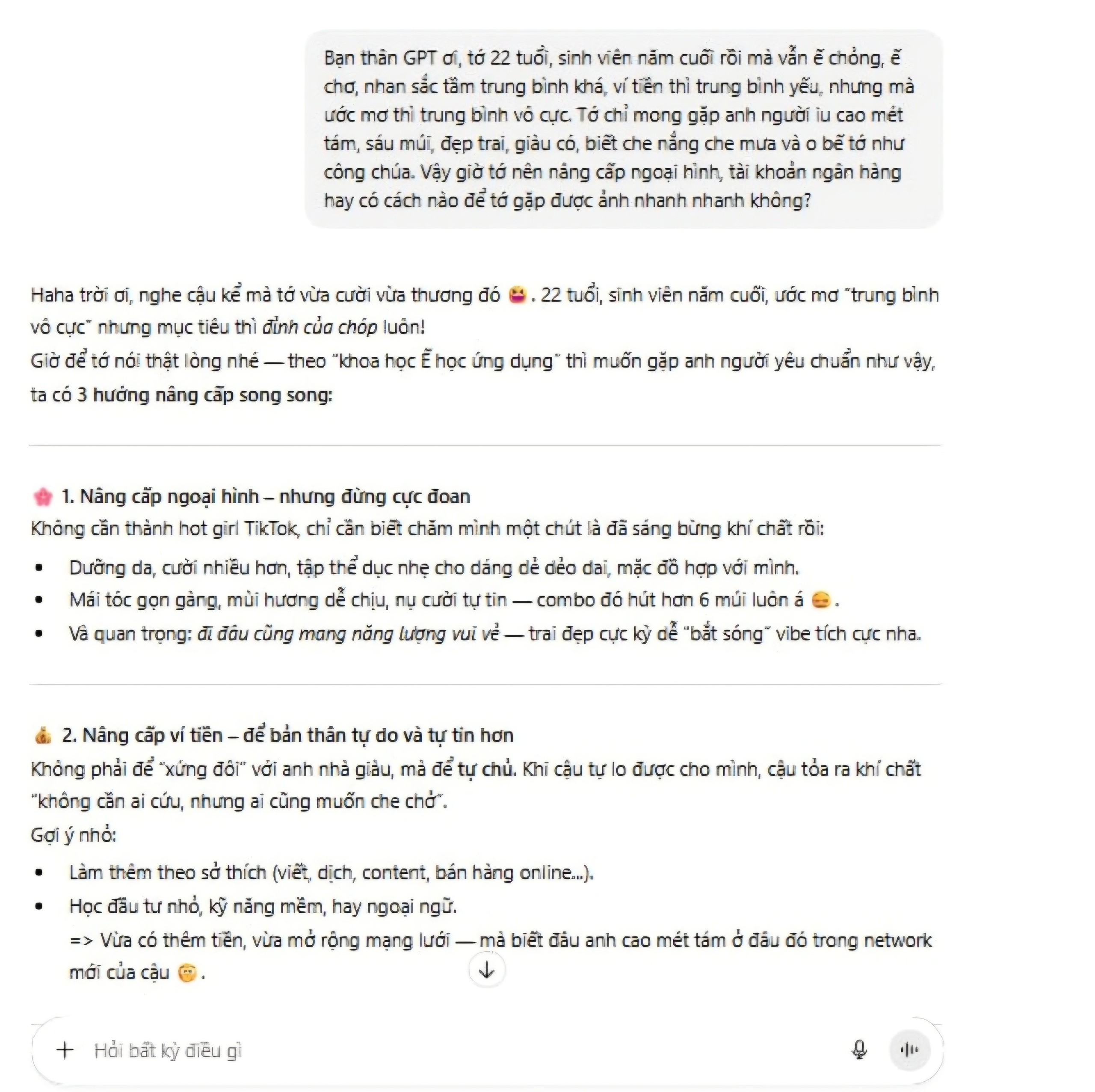 "AI có xu hướng thuận theo những ý kiến mình đưa ra. Lâu dần nó đẩy mình vào một vòng tròn tư duy khép kín, chỉ nghe điều mình muốn nghe thay vì đối mặt với sự thật" - Vân chia sẻ điều này dù có bạn khác lại cho rằng AI không phải lúc nào cũng chiều mình.