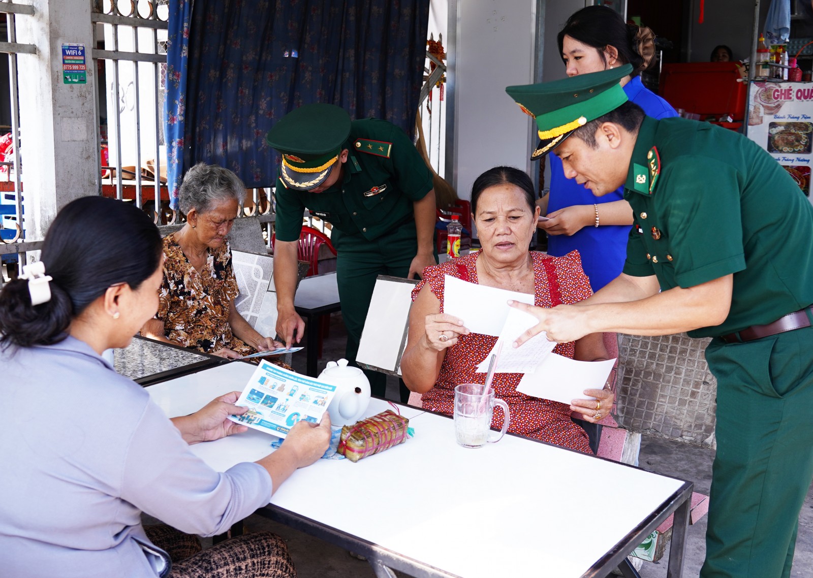 Cán bộ Đồn Biên phòng Cửa khẩu Vĩnh Hội Đông, Ban Chỉ huy Bộ đội Biên phòng tỉnh An Giang phối hợp Đoàn Thanh niên đến từng nhà dân để tuyên truyền, phổ biến pháp luật.