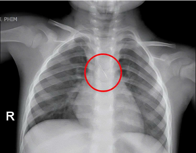 Bé trai nhập viện trong tình trạng ho sặc dữ dội, được xác định hóc kim chọc tủy dài 22mm rơi vào đường thở khi đang làm răng.