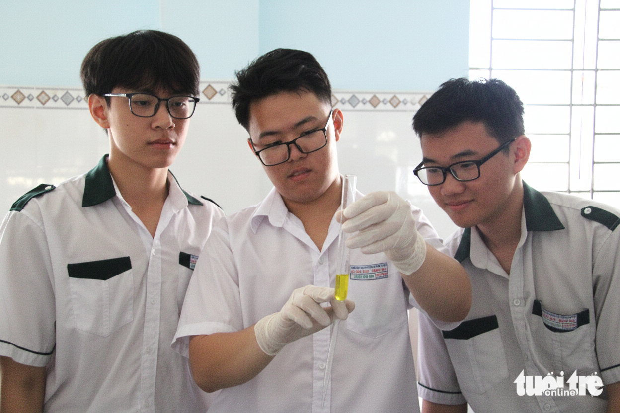 Gia Bảo học tập, thực hành thí nghiệm hóa học cùng các bạn trong lớp - Ảnh: ĐỨC CƯỜNG
