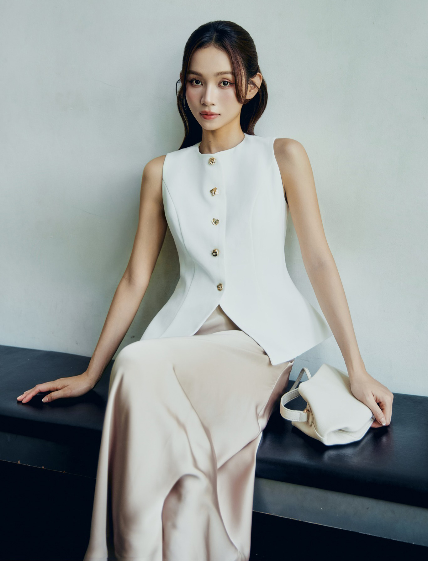 Áo vest cách điệu với những đường nét cổ điển kết hợp của gile và áo vest với sự chỉn chu về phom dáng, sang trọng và thanh lịch để diện cùng chân váy lụa dáng dài. ẢNH: SOMEHOW