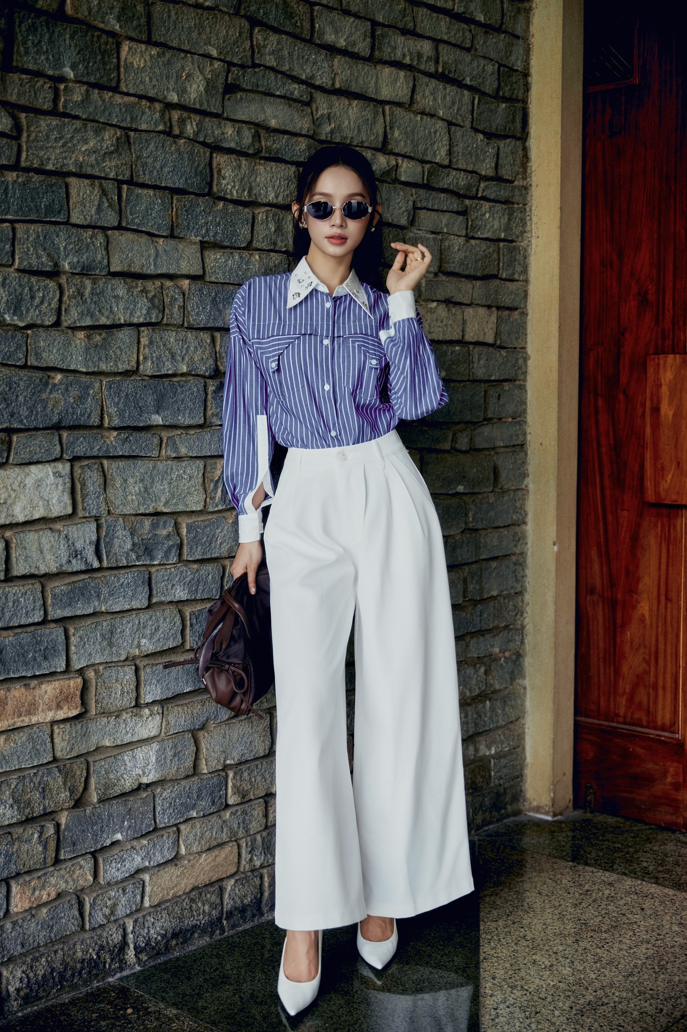 Nàng có thể chọn bản phối quần âu trắng kết hợp áo kẻ sọc cách điệu để diện đi làm, đi học, tham dự các buổi hội họp, sự kiện... ẢNH: SOMEHOW