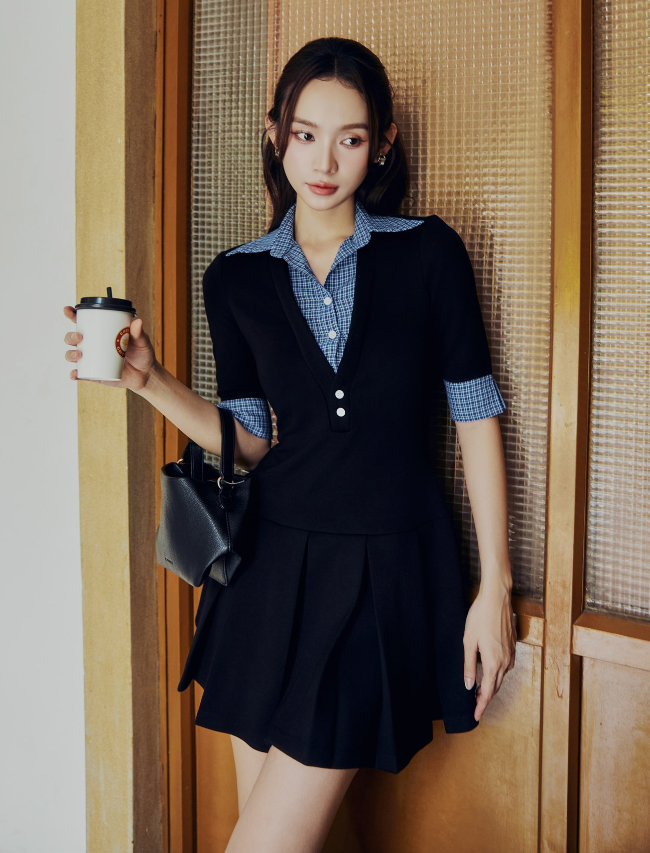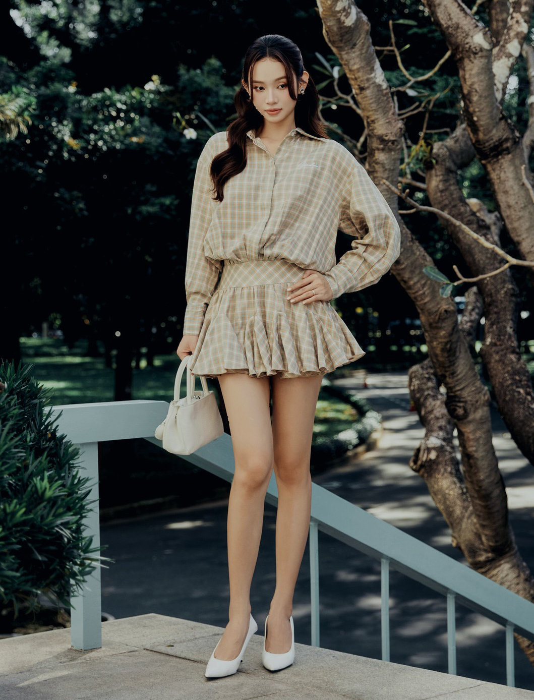Phong cách trẻ trung, hiện đại và năng động từ các thiết kế váy xếp ly phối chất liệu dệt kim và vải kate/cotton họa tiết kẻ ô vuông. ẢNH: SOMEHOW
