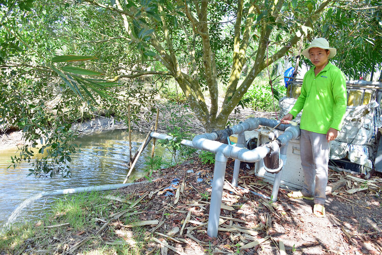 Mong muốn nâng cao chất lượng canh tác, ông Dũng đầu tư hệ thống tưới phun tự động trên cao kết hợp châm phân cho vườn sầu riêng. Được địa phương hỗ trợ một phần kinh phí từ nguồn xây dựng nông thôn mới, ông hoàn thành mô hình và sử dụng từ năm 2024 đến nay. “Mô hình giúp tôi tiết kiệm nước tưới, rửa sương muối, ngừa cháy lá cho sầu riêng rất tốt. Nhờ đó, tôi tiết kiệm được chi phí sản xuất, tăng lợi nhuận”, ông Dũng chia sẻ.