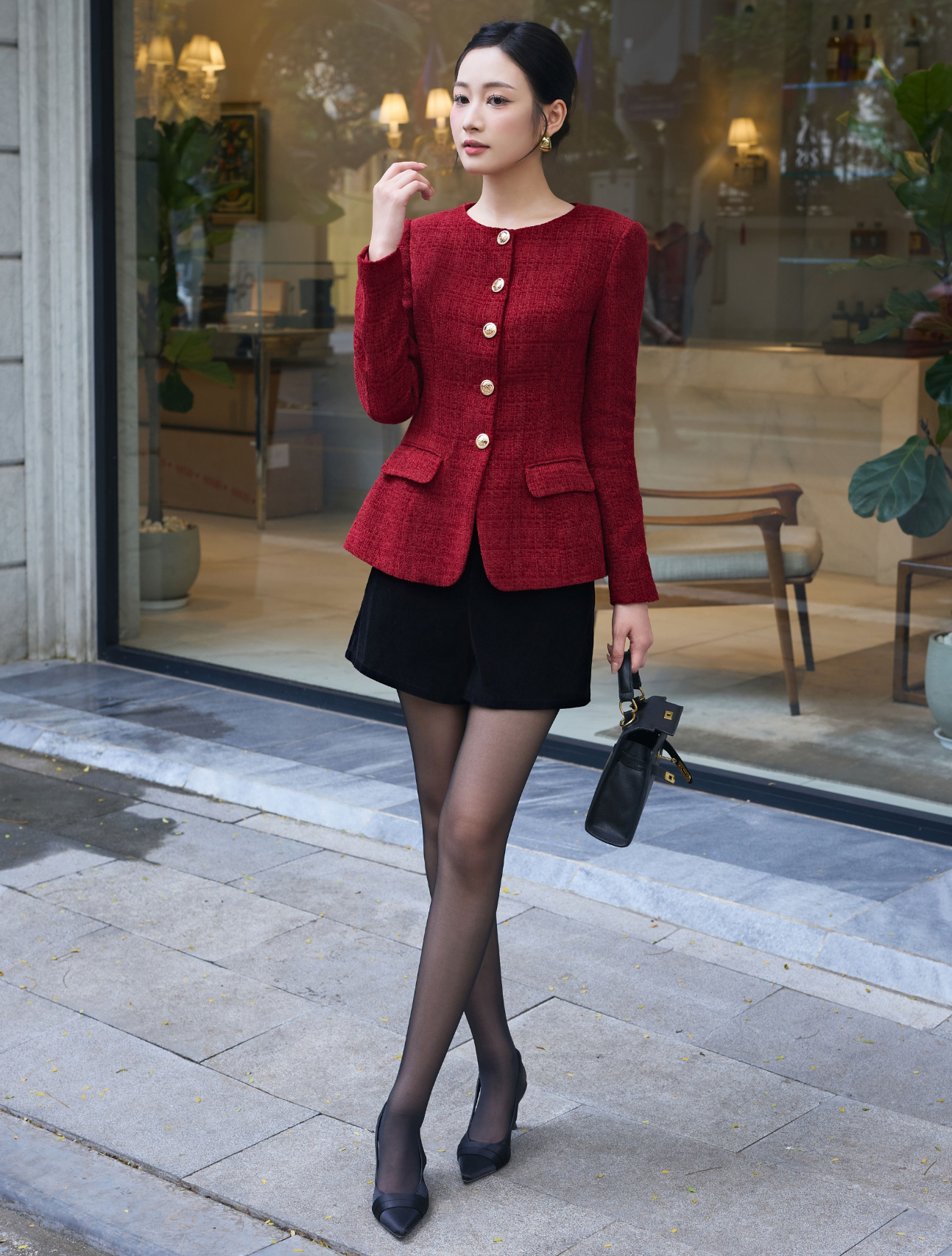 Đỏ và đen đầy kiêu hãnh, sắc sảo và cuốn hút. Bản phối gợi lên hình ảnh vừa nữ tính vừa quyền lực mạnh mẽ. Áo tweed đỏ phối chân váy nhung dáng chữ A cùng quần tất và giày cao gót tông đen tạo nên diện mạo hoàn mỹ cho nàng. ẢNH: CEVONNI
