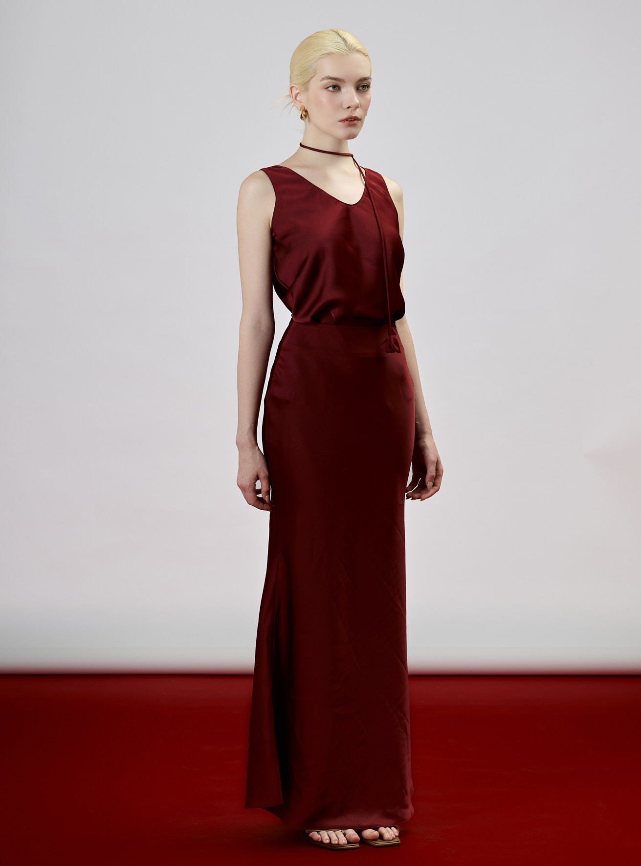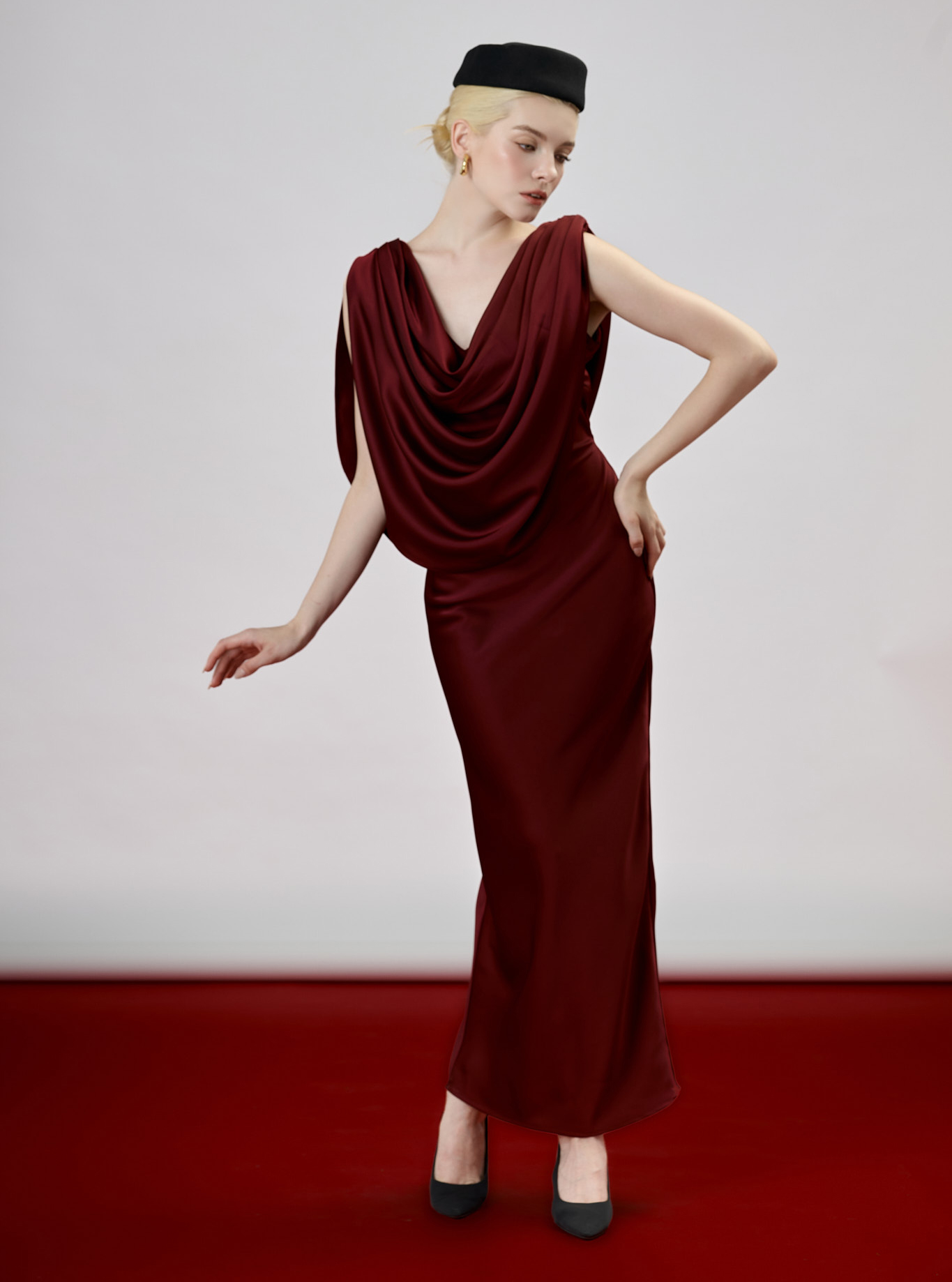 Đầm dự tiệc cổ đổ mềm mại và nữ tính qua sắc đỏ đô kiêu kỳ và quyến rũ. Phụ kiện mũ, giày và ví cầm tay màu đen tạo nên diện mạo hoàn chỉnh giúp nàng gây ấn tượng với mọi đám đông. ẢNH: CATCI