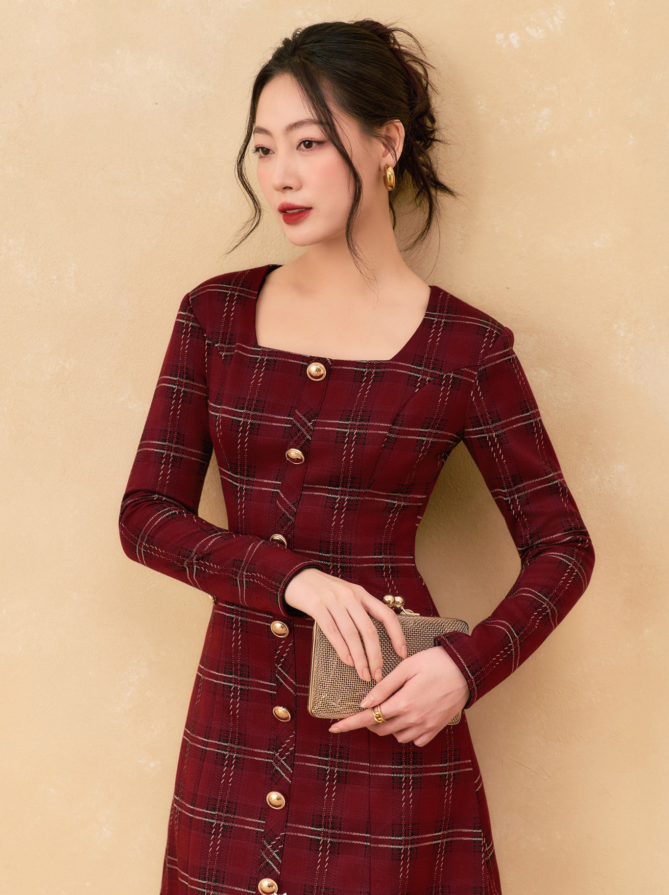 Tông màu đỏ đậm - đỏ tía hay đỏ đô chính là gam màu vượt thời gian. Gam màu này được đặt làm nền cho họa tiết kẻ ô vuông cổ điển của dáng đầm chữ A điểm hàng cúc vàng sang chảnh, quý phái. ẢNH: CEVONNI