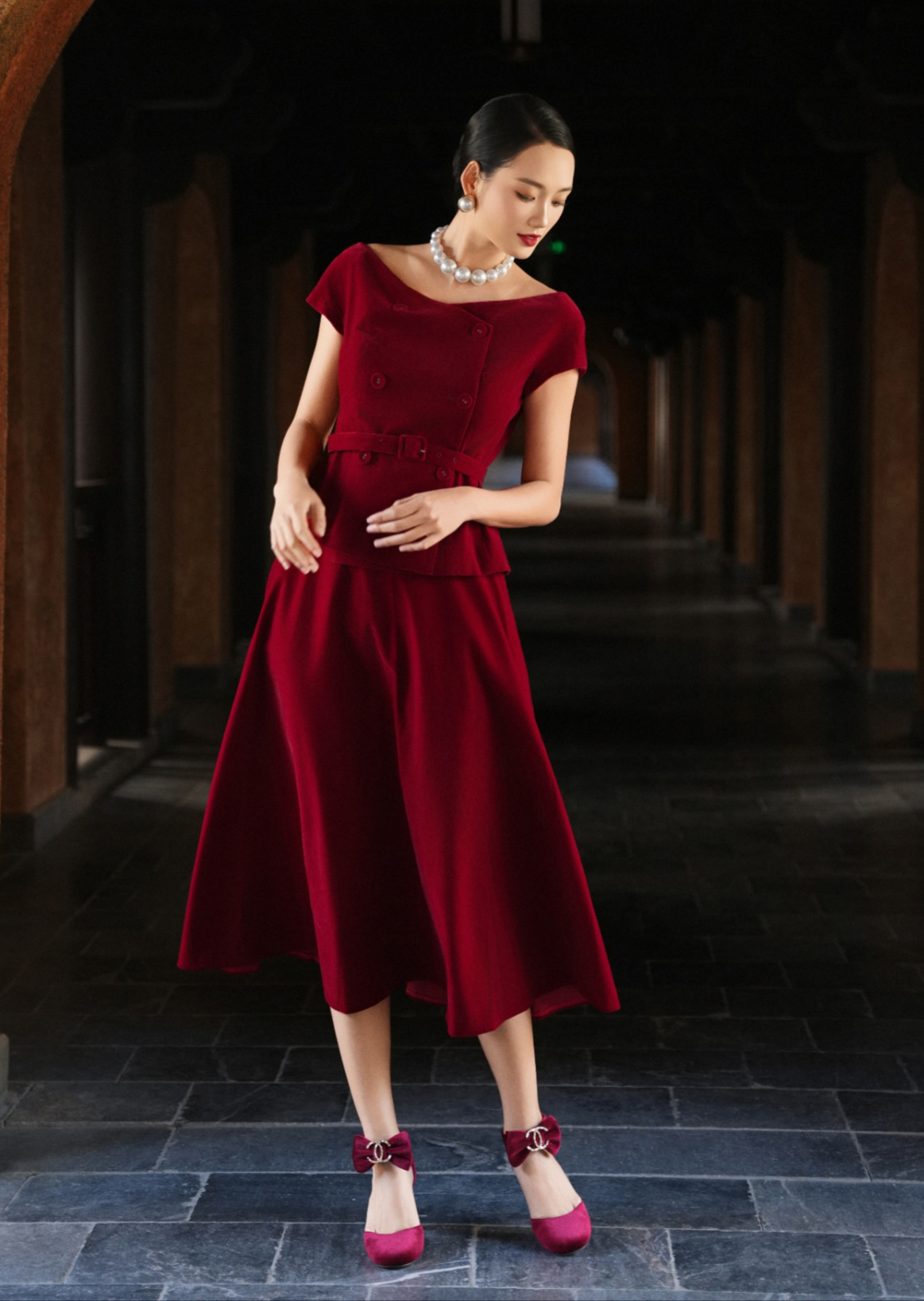 Đầm nhung đỏ peplum tôn vòng eo và giấu nhược điểm hình thể tốt. Chất nhung phối trang sức ngọc trai, giày đính nơ nhung đồng điệu biến nàng thành tâm điểm của mọi ánh nhìn. ẢNH: SIXDO