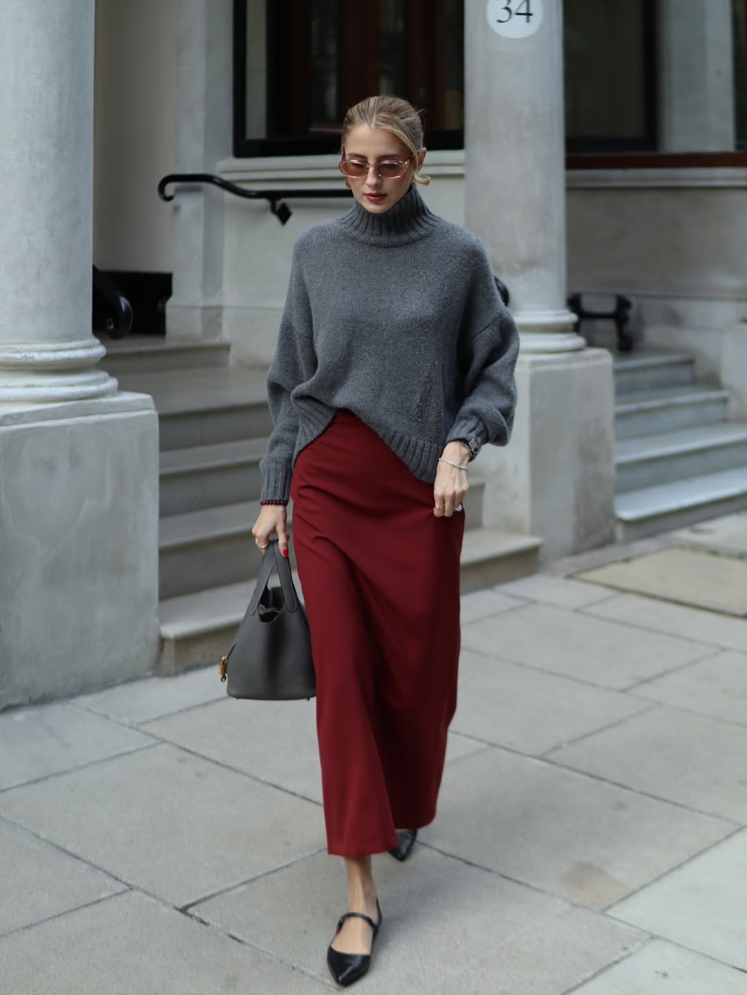 Áo len oversized xám phối chân váy lụa dáng dài và giày mũi nhọn là bản phối casual thoải mái, dễ chịu, thanh lịch nhưng vẫn cực kỳ hợp xu hướng. ẢNH: VALEIRIA KEI