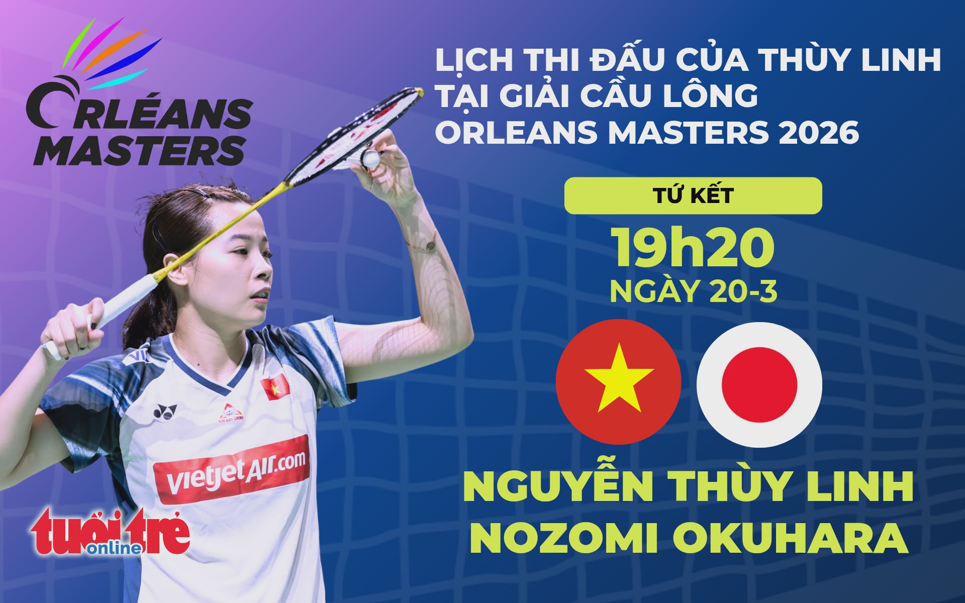 Trận đấu giữa Thùy Linh và Nozomi Okuhara dự kiến bắt đầu lúc 19h20 ngày 20-3. Thời điểm bắt đầu trận đấu có thể thay đổi tùy vào tình hình các trận đấu còn lại.