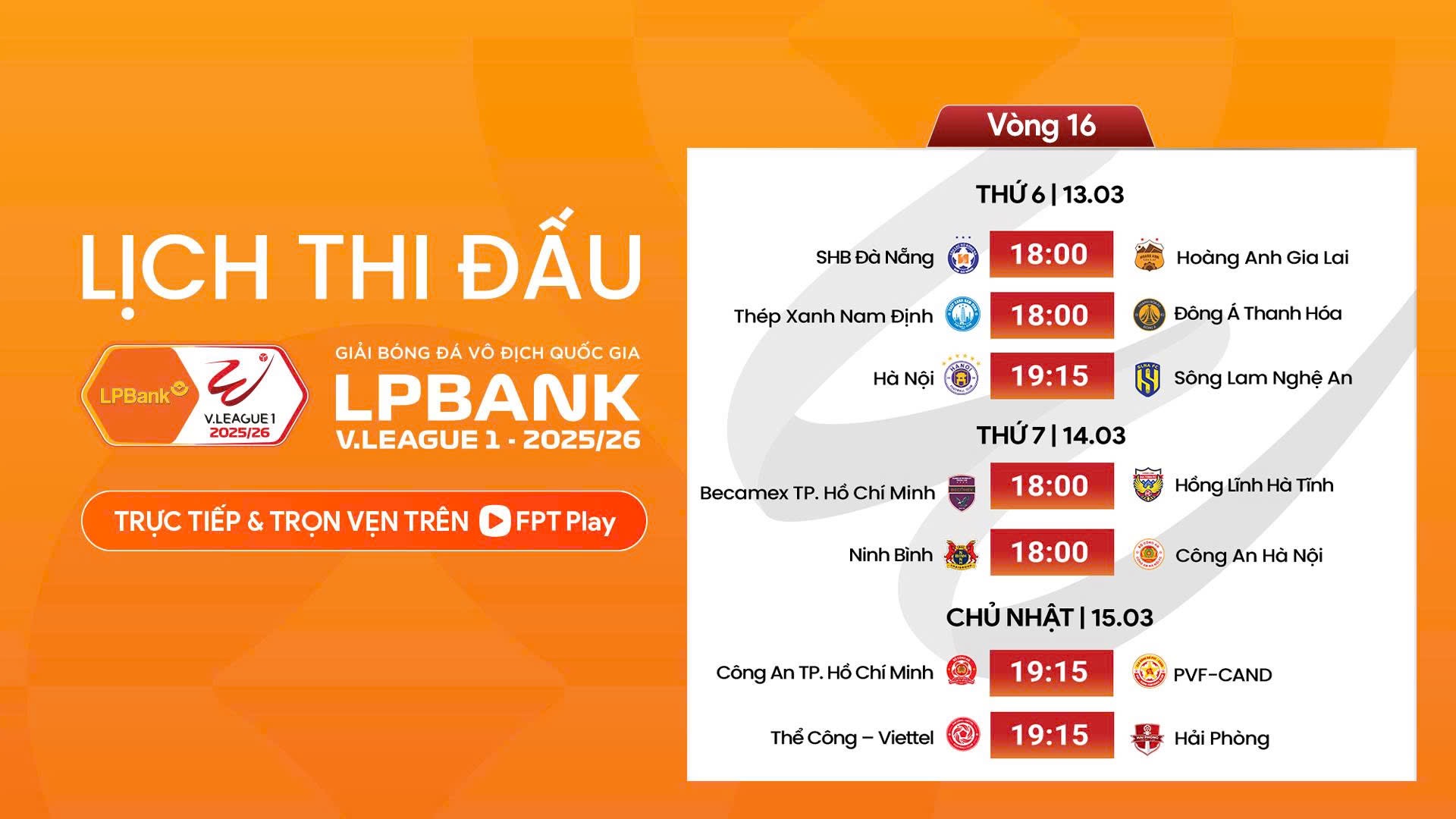 Các trận đấu còn lại của vòng 16: Becamex TP.HCM gặp Hồng Lĩnh Hà Tĩnh (18 giờ ngày 14/3); CLB Công an TP.HCM gặp PVF-CAND (19 giờ 15 ngày 15/3).
